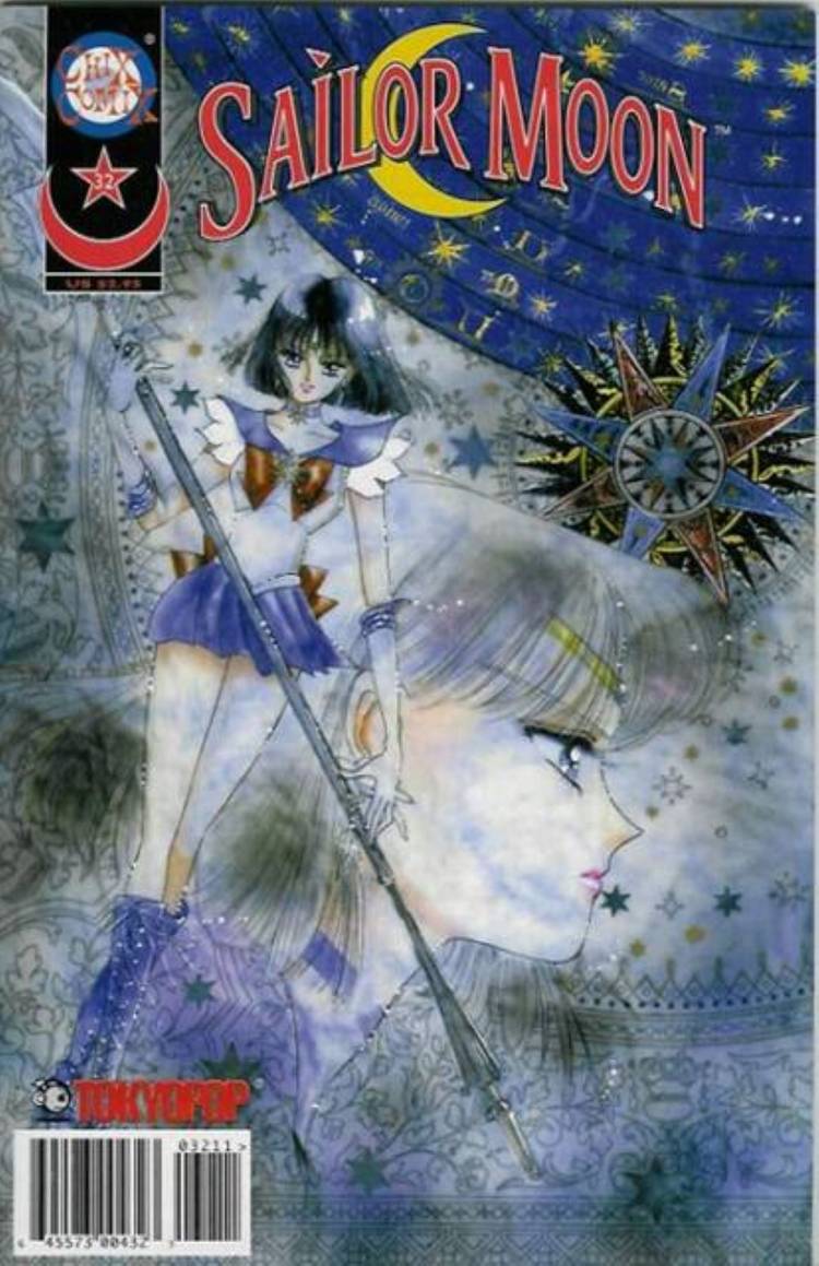 Sailor Saturn se destaca en la portada del volumen 32. Está de pie a la izquierda sosteniendo su Silence Glaive, la “guadaña de la Diosa de la Muerte”, con su rostro contemplativo como un fantasma en el fondo. La ilustración también está teñida de azul y gris, creando un entorno armonioso que da paso a los diseños detallados y los amarillos brillantes esparcidos por todas partes.