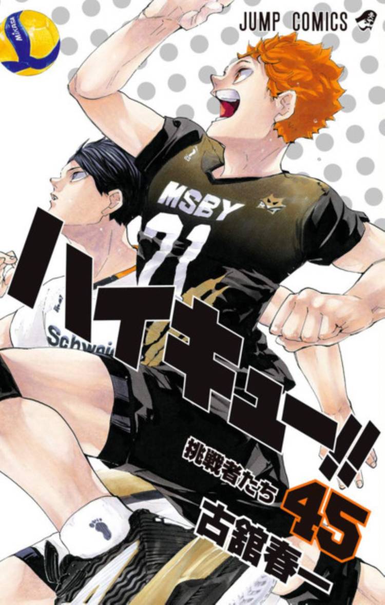 Hinata y Kageyama saltan a través de la página en la portada final del libro. ¡¡Haikyu!! Manga. Los dos personajes principales visten sus uniformes de equipo para adultos y miran al cielo con una confianza madura. Sus cuerpos parecen más definidos con el entrenamiento continuo, aunque sus posturas recuerdan a sus carreras en la escuela secundaria. La expresión alegre de Hinata y su cabello erizado en primer plano. Mientras tanto, el estilo más reservado de Kageyama lo respalda.