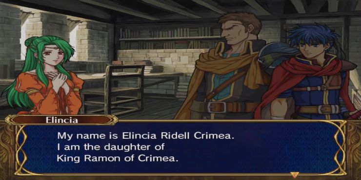 Dado que la princesa Elincia Ridell Crimea vivía como una plebeya fuera del palacio para mantenerla a salvo, sobrevivió al ataque, y ahora Ike y el resto de su grupo de mercenarios deben ayudar a Elincia a recuperar su trono. Como una de las mejores protagonistas femeninas de emblema de fuego, Elincia es resistente, bondadosa y humilde. A pesar de ser realeza, su educación plebeya le permitió entrenarse en la lucha con espadas, aprender tareas básicas y conectarse con la gente de su país.
