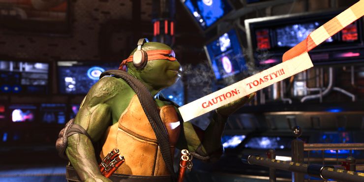 En injusticia 2, cada vez que una de las Tortugas Ninja mutantes adolescentes comía pizza, la tomaba de una caja que tenía una advertencia en el costado: “Advertencia: ¡Toasty!” Esa no es la única referencia; Miguel Ángel también dice las palabras “Ven aquí”. cuando agarra una rebanada, que es un guiño a la famosa línea de Scorpion de Mortal Kombat.