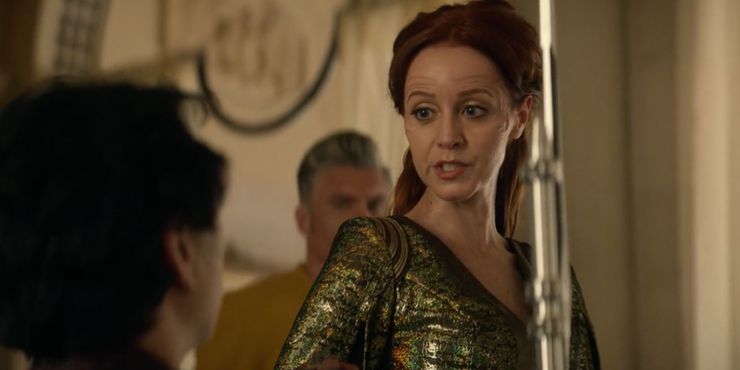 Mientras Spock estaba teniendo su momento de “Freaky Friday” en “Spock Amok”, el Capitán Pike estaba en negociaciones cruciales con el Protectorado de R’ongovian, que usa naves ceremoniales impulsadas por velas solares.