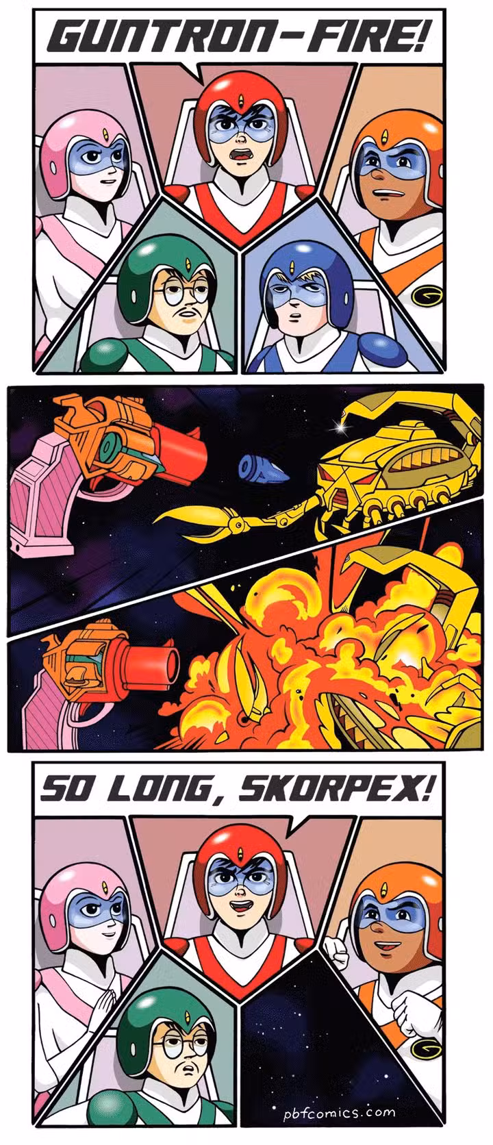 Pero en algunos casos, como parece en esta tira, es posible que no todos sean conscientes de que se necesita un sacrificio y es posible que no estén de acuerdo con ello. En una obra de Voltron, los cinco héroes se unen para formar Guntron y destruir al malvado Skorpex. Pero, al hacerlo, el miembro azul claramente muere. Y, basándose en la cara del miembro verde, que resulta ser la siguiente bala, no sabía que eso podría suceder.