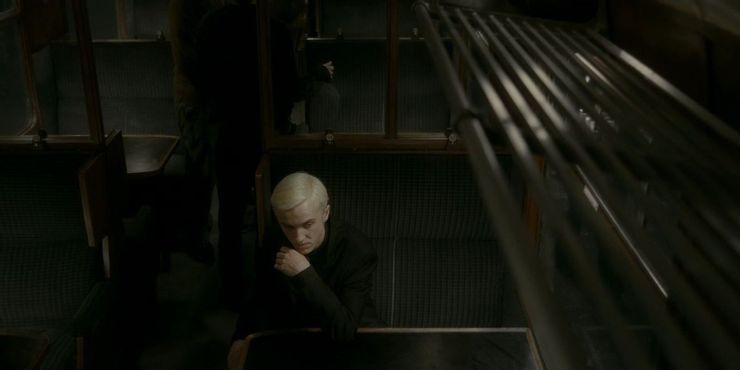 Convencido de que Malfoy está tramando algo, Harry se cuela en su compartimiento cubierto con la Capa de Invisibilidad. Malfoy se da cuenta y luego envía a todos por delante para que pueda atrapar a Harry solo y, congelándolo con una maldición que lo ata al cuerpo, pisotear su nariz. No es nada que no se pueda arreglar con magia, pero sigue siendo bastante espantoso, por no mencionar doloroso.