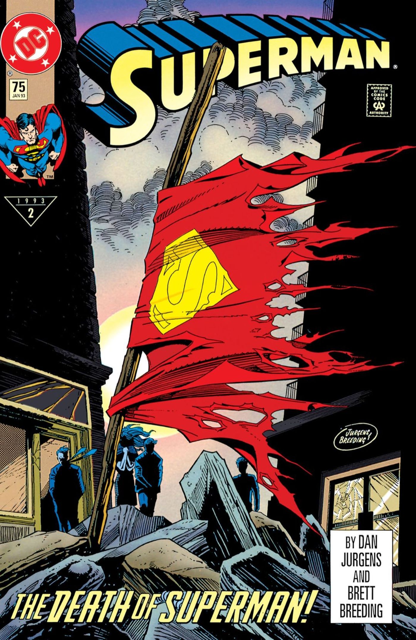 Pocas portadas son tan escalofriantes como la asociada a la muerte de Superman. Superman #75 la portada de Dan Jurgens y Brett Breeding muestra los restos de la capa del Hombre de Acero ondeando con la brisa. Los civiles miran conmocionados cómo ha sucedido lo impensable: Superman ha sido asesinado por el monstruo arrasador conocido como Doomsday. Clark Kent se había enfrentado a probabilidades imposibles, pero por primera vez fue derribado por un enemigo y lo pagó con su vida. Nada demuestra más el peso de la muerte del héroe que ver un trozo de su uniforme esparcido entre los escombros de una lucha devastadora.