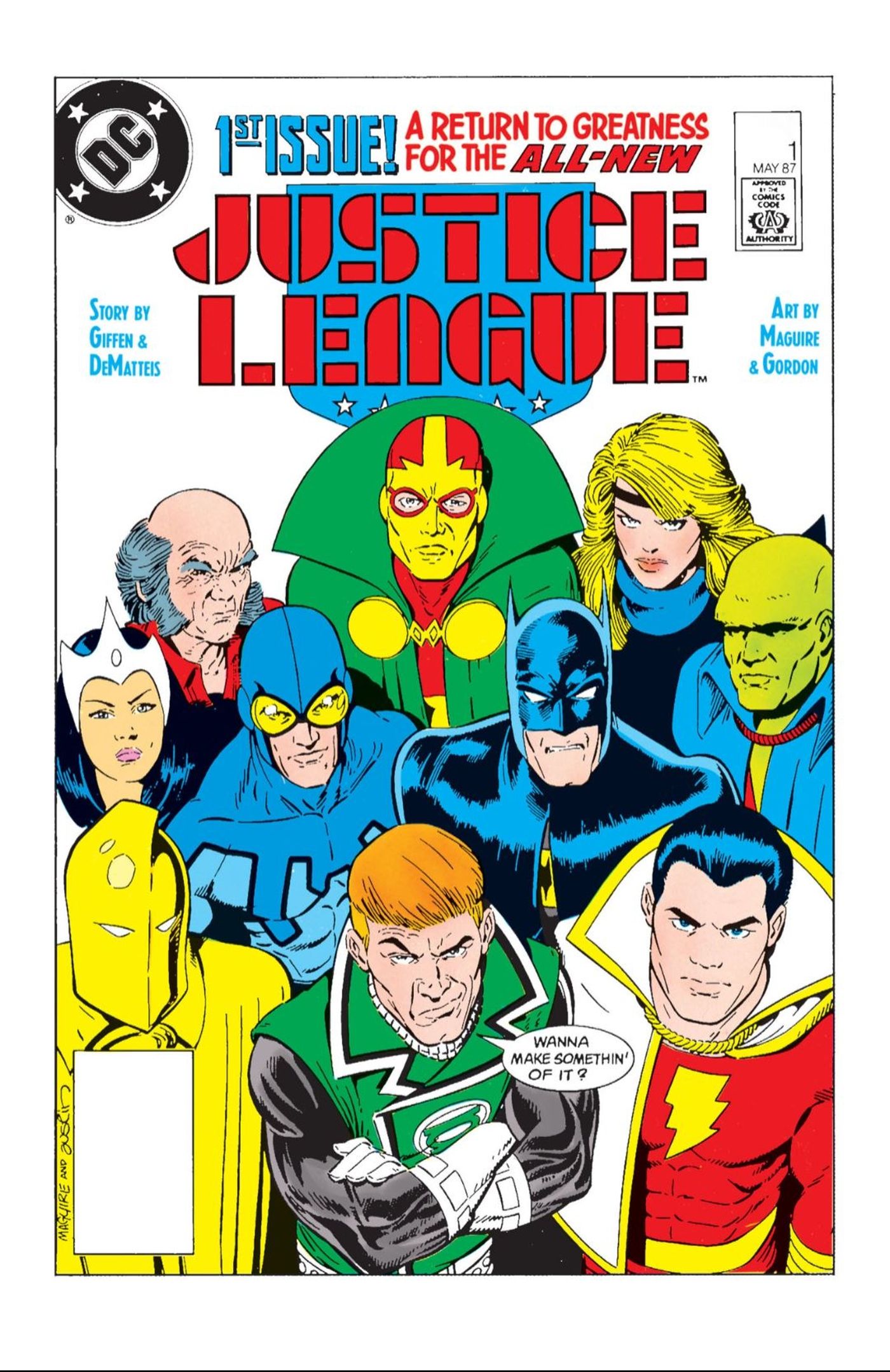 Pocas obras de arte cómicas han sido satirizadas tanto como la portada de Liga de la Justicia #1. Justice League International debuta con su actitud icónica desde el primer momento, viendo al equipo agrupado con varias sonrisas y ceño fruncido en sus rostros. La comedia por la que el equipo es conocido se vuelve evidente con el desafío de Guy Gardner de “¿Quieres hacer algo con eso?”. La portada de Kevin Maguire y Terry Austin se ha recreado en numerosas ocasiones, incluso por el propio Maguire, quien ha vuelto a dibujar al equipo como treinta años mayor o enmascarado y socialmente distanciado cuando golpeó COVID-19.