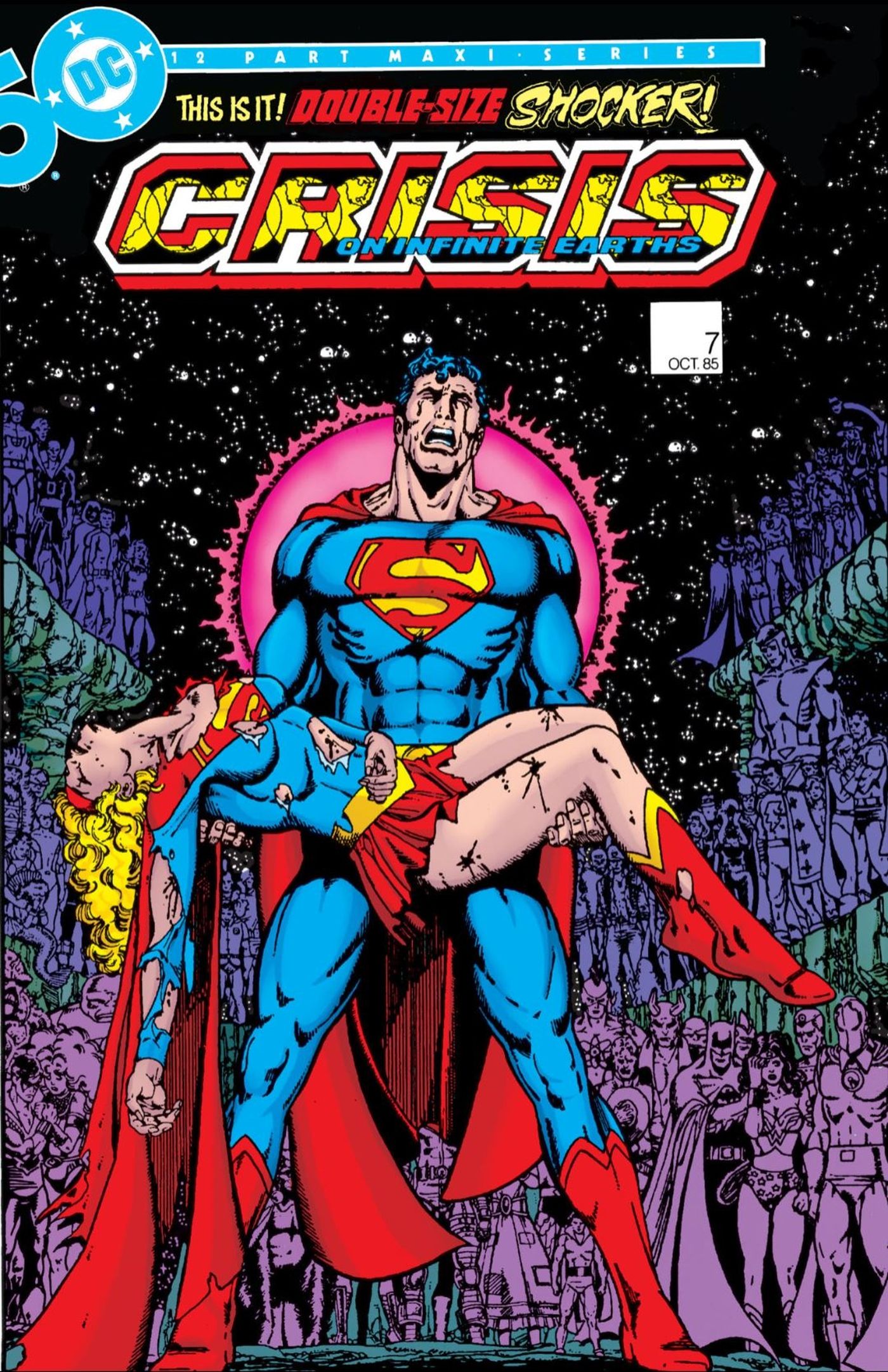 Crisis en tierras infinitas fue la suma de cincuenta años de narración de historias para DC, y una de las sagas más poderosas e innovadoras que el editor haya lanzado. Sin embargo, la tragedia golpeó a la familia Superman durante el evento como la portada de Crisis en Tierras Infinitas #7 por George Pérez implica. Aunque Kara dio todo para ayudar a detener el Anti-Monitor, no fue suficiente y sufrió a manos del villano cósmico. La expresión angustiada de Clark en la portada lo dice todo. The Crisis no fue solo una muestra de la cabalgata de personajes de DC, fue un evento desgarrador que tuvo consecuencias reales para los héroes.