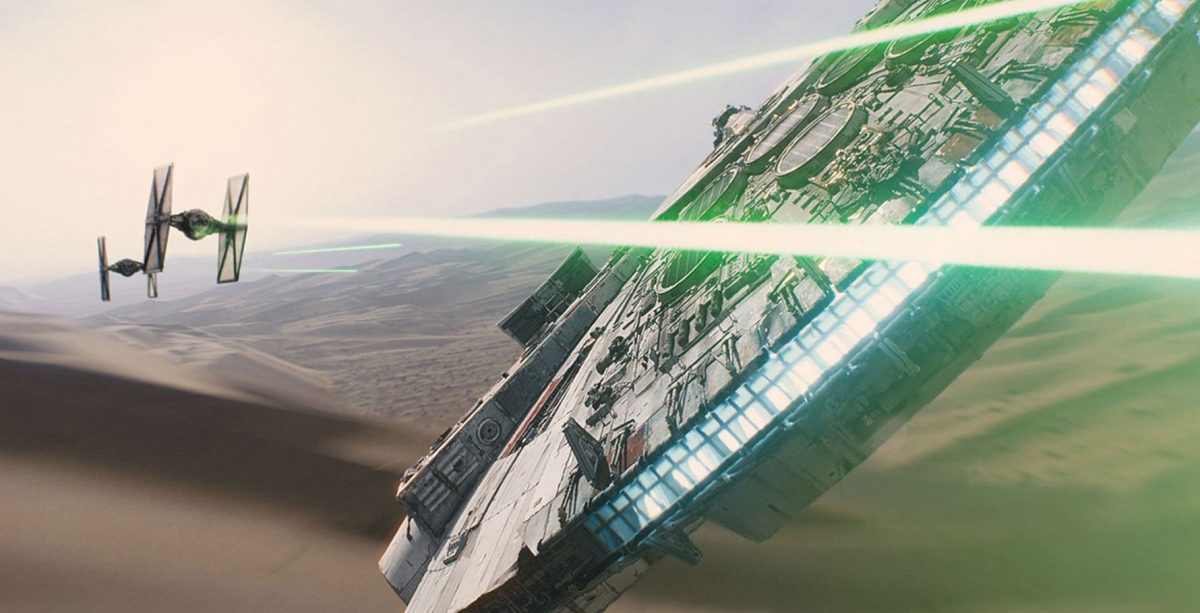 Otro ejemplo es cuando Rey y Finn huyen de Jakku en el Halcón Milenario y son perseguidos por los restos derribados de un Destructor Estelar Imperial por parte de un par de luchadores TIE. Fue una secuencia espectacular.