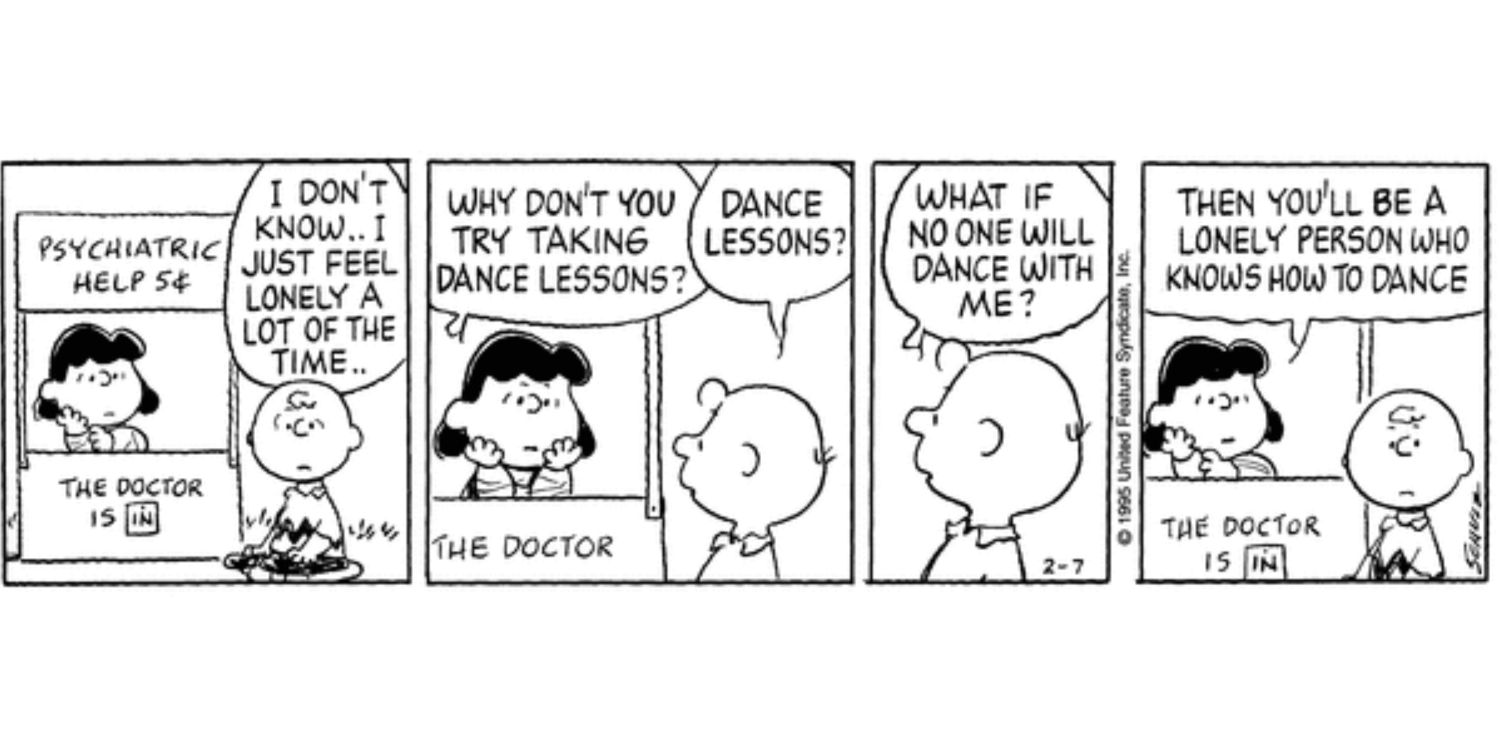 Charlie Brown, lógicamente, pregunta cómo solucionará esto su soledad si nadie baila con él, a lo que Lucy le hace saber que al menos será un buen bailarín. Si bien Lucy ofrece la buena lección de que Charlie Brown conocerá una habilidad que será útil en situaciones sociales, definitivamente podría haber profundizado un poco más para encontrar una mejor solución a los sentimientos de aislamiento de Charlie Brown. Sin embargo, no es justo juzgar demasiado las habilidades psiquiátricas de Lucy, ya que ella es solo una niña pequeña.