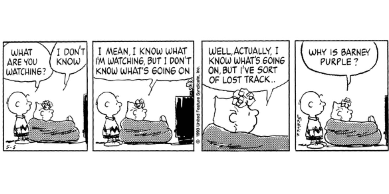 Miseria no siempre fue la tira cómica de mayor actualidad, lo que ha ayudado a que la tira sea tan atemporal. Sin embargo, esta tira es una desviación, ya que se ve a Sally viendo el famoso programa de los 90. Curiosamente, su única pregunta sobre el programa es por qué Barney es morado. Por qué Sally está más perpleja acerca de por qué un dinosaurio que habla es morado que por qué un dinosaurio habla en primer lugar, es una incógnita.