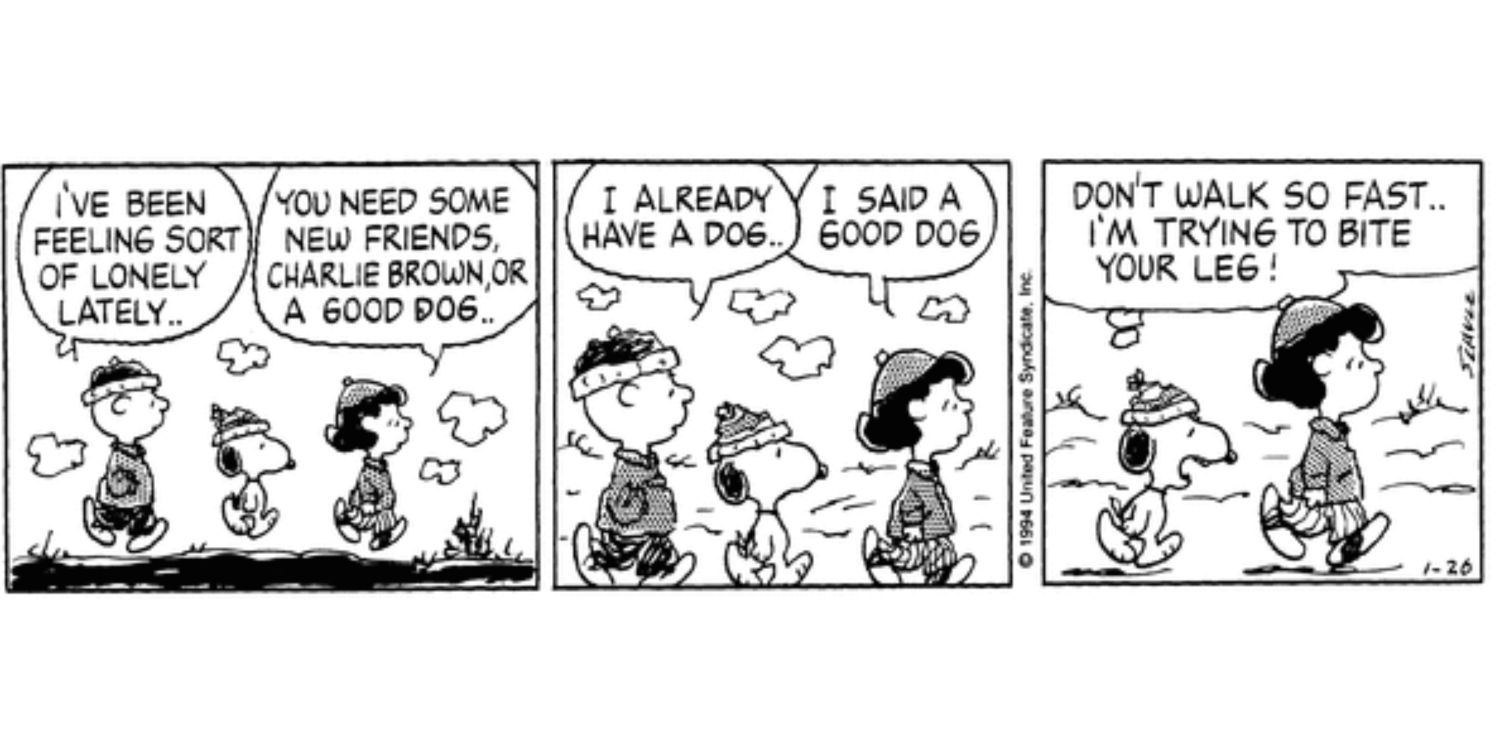 Como se muestra en esta tira, Lucy le dice a Charlie Brown que debería conseguir un buen perro para solucionar su soledad. Charlie Brown le recuerda a Lucy que ya tiene un perro, a lo que Lucy, sarcástica, enfatiza que necesita un perro. bien perro. La reacción de Snoopy es intentar pellizcarle las piernas. Ese es un insulto duro que ella le lanza, lo que hace difícil juzgar a Snoopy por su hilarante reacción.
