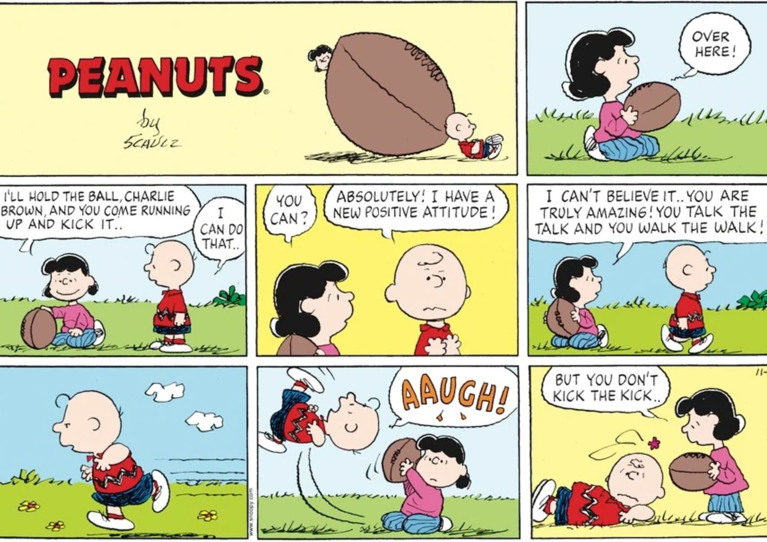 Charlie Brown se entusiasma y se emociona, pensando que esta vez pateará la pelota. Lucy finge que realmente lo está apoyando y tiene fe en que tendrá éxito. Lucy siendo Lucy, sin embargo, arruina el desfile de Charlie Brown y sin duda pone fin a sus días de actitud positiva.