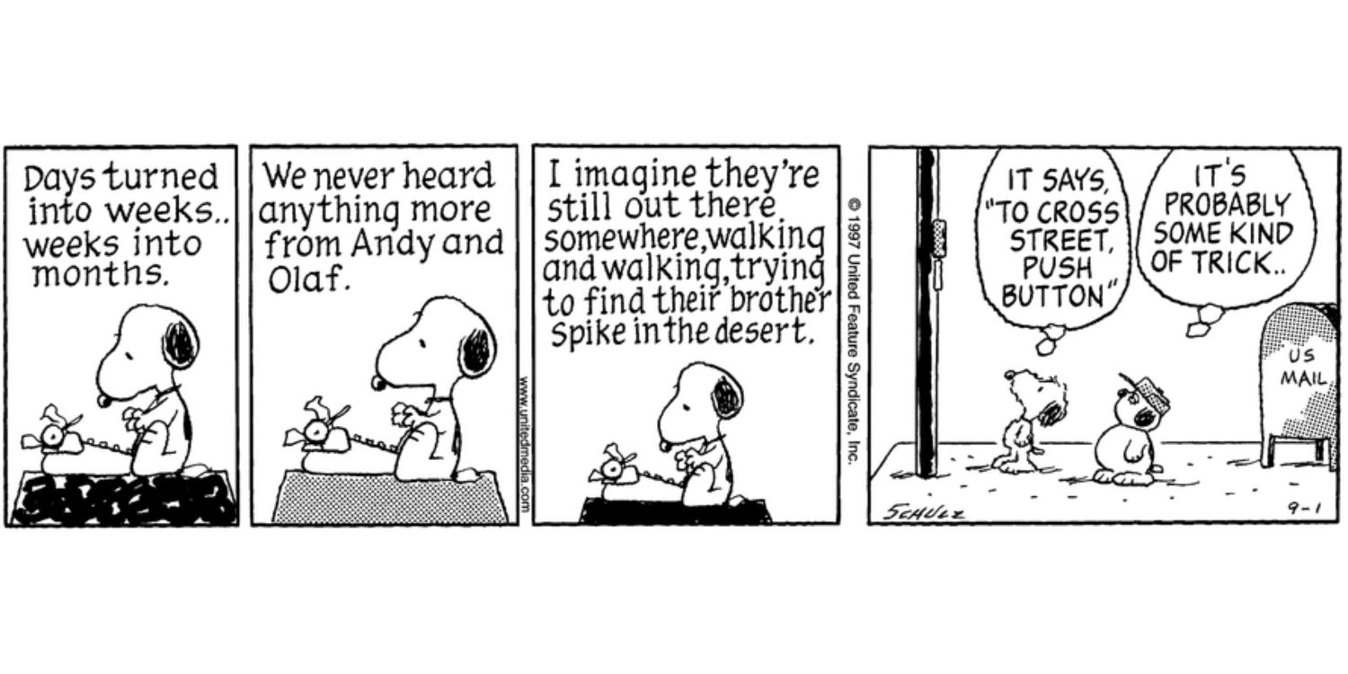 Desde su presentación en los años 90, Andy se ha asociado con su hermano Olaf y su constante broma de perderse siempre. En esta tira, que se publicó tres años después del debut de Andy, se observa que los hermanos están perdidos una vez más. En el último panel, el lector ve exactamente lo que ha estado haciendo: esperando la señal de caminar en un cruce de peatones. A menos que ellos u otra persona presionen el botón del paso de peatones, permanecerán allí por mucho más tiempo.