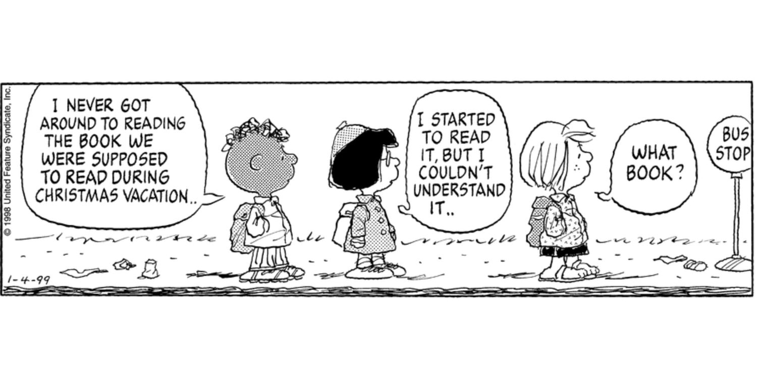 Como resultado, se parece mucho más a Marcie que a Patty. Un ejemplo es esta tira del último año de los noventa. En la tira, Franklin pregunta a sus compañeros si hicieron la lectura asignada durante las vacaciones de Navidad. Marcie admite que lo intentó pero no pudo terminar. La respuesta de Patty, en cambio, es un poco más preocupante porque responde que desconocía por completo la lectura y ni siquiera sabe qué libro le asignaron. Los fanáticos de Peppermint Patty no se sorprenderán por su falta de lectura, pero pueden contar con otra mala calificación para agregar a la lista.