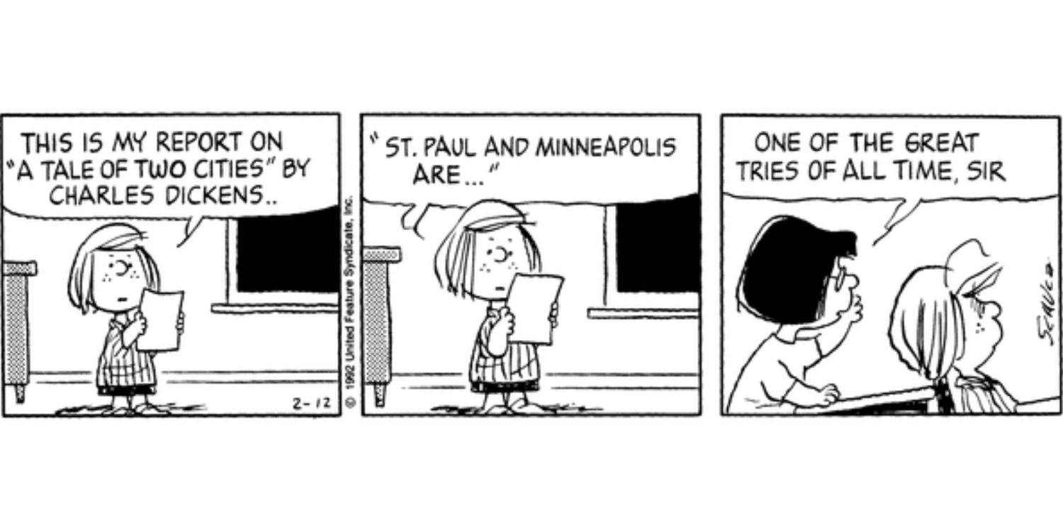 Si bien Marcie es académicamente lo opuesto a Peppermint Patty, ella siempre brinda apoyo y aliento. Un excelente ejemplo es cuando Patty lee su informe sobre el clásico de Charles Dickens, Un cuento sobre dos ciudades. Ella revela que en realidad nunca leyó el libro en el momento en que menciona las Ciudades Gemelas, St. Paul y Minneapolis, ambas ubicadas en Minnesota. Marcie elogia el valiente intento de su amiga y su fracaso final.