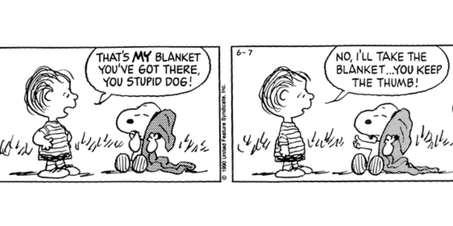 Lucy ha tratado de sacar a su hermano de su manta. Además, incluso Snoopy ha intentado quitarle la manta a Linus. Visto en esta tira, Snoopy está haciendo su mejor imitación de Linus con el pulgar en la boca, completo con la propia manta de Linus. De manera confiable, Linus está molesto porque Snoopy tiene su manta y le exige que la recupere. En cambio, Snoopy ofrece su pulgar, que no es lo que Linus tenía en mente.