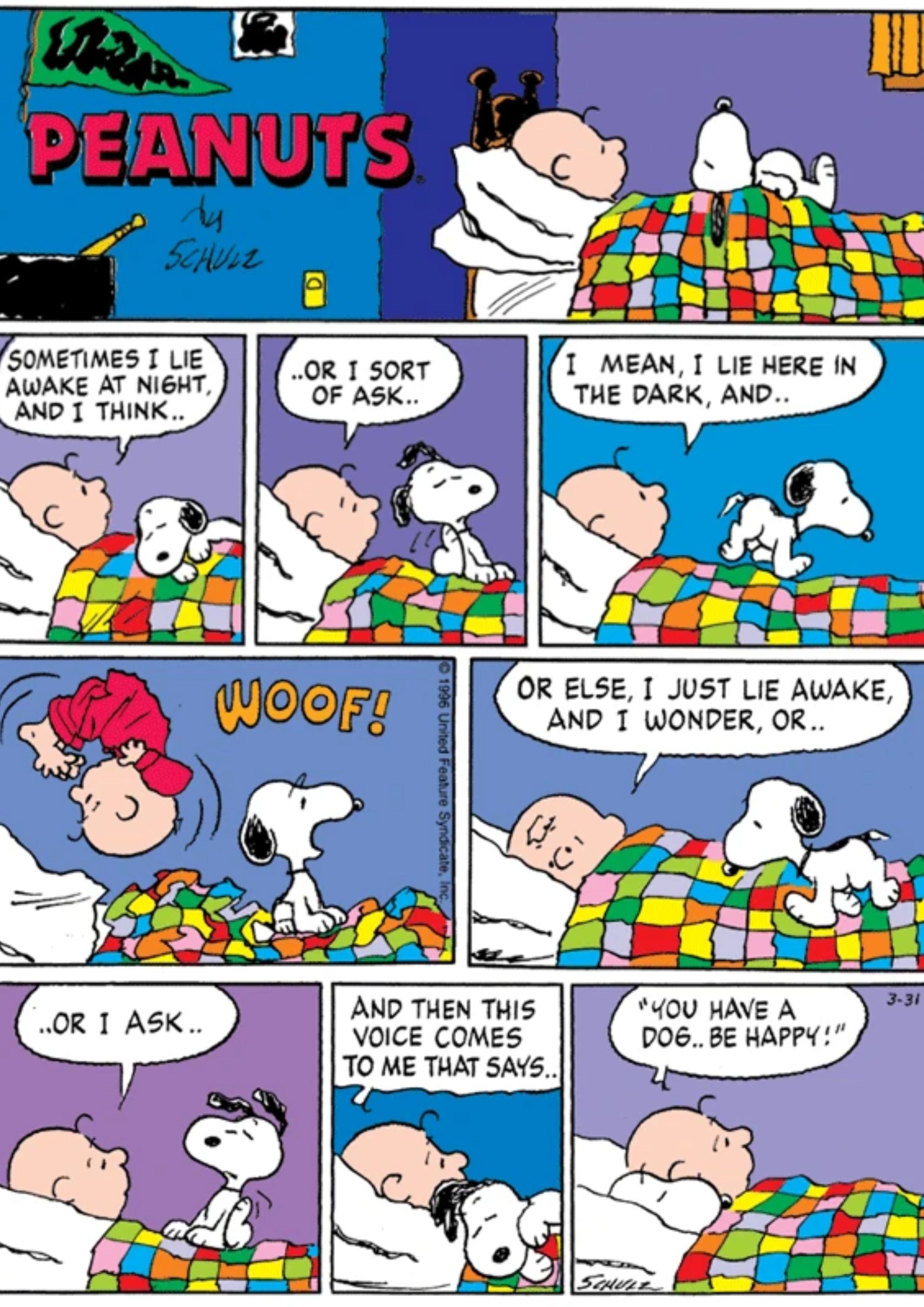 “/> La mayoría ha experimentado pensamientos durante la noche que los han mantenido despiertos. Charlie Brown, siendo la bolita de neurosis que es, admite ser propenso a esas noches llenas de pensamientos en esta tira. Sin embargo, no puede terminar un pensamiento porque Snoopy sigue distrayéndolo y llamando su atención.