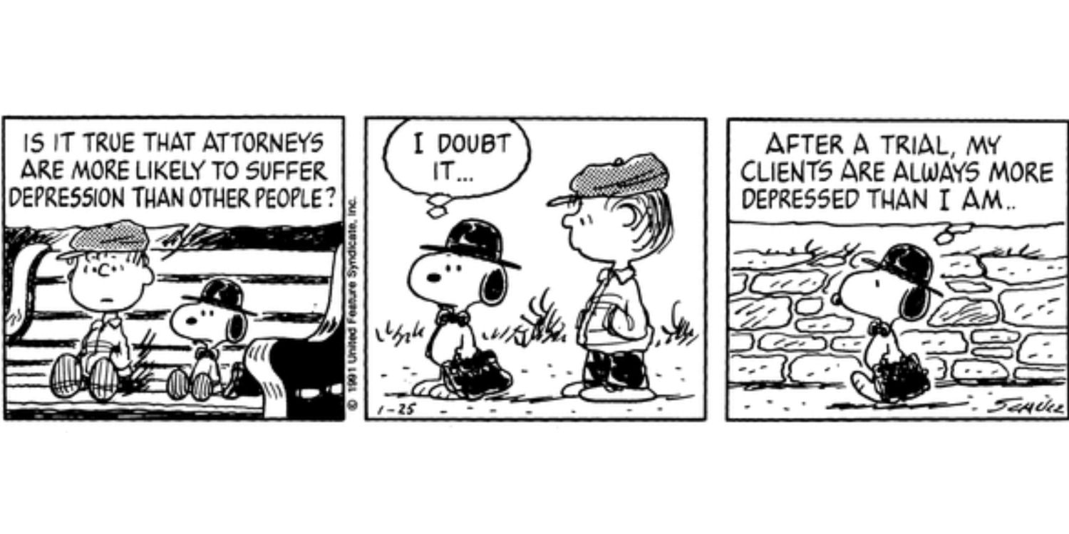 Dada su falta de experiencia jurídica y su incapacidad para ganar un solo caso, tiene sentido que sus clientes se sientan al menos decepcionados y, como mucho, deprimidos. En esta tira, se le pregunta a Snoopy si es cierto que los abogados se deprimen con más frecuencia en comparación con quienes desempeñan otros trabajos. Él responde que duda que eso sea cierto porque sus clientes son siempre los deprimidos, nunca él. Tal vez si Snoopy lograra ganar un caso por una vez, sus clientes estarían más optimistas para variar.
