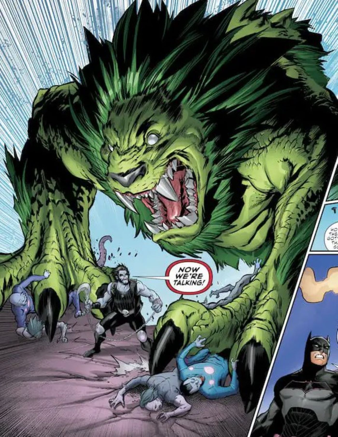 En la cuestión de alto riesgo – Liga de la Justicia: Sin justicia #2 por Scott Snyder, James Tynion IV y Joshua Williamson: mientras está en una misión, Chico Bestia parece una molestia a los ojos de Deathstroke, cuando dice: “Es por eso que nunca se debe permitir que los Jóvenes Titanes estén en la mesa de adultos.” Lobo lleva a Chico Bestia a un lado, diciéndole que se suelte y se convierta en la bestia más loca que pueda imaginar. Chico Bestia se convierte en un híbrido León/Dino y usa esta forma intimidante para atravesar un ejército robótico. Esta forma le ganó el respeto de Lobo. , Lex Luthor e incluso Batman