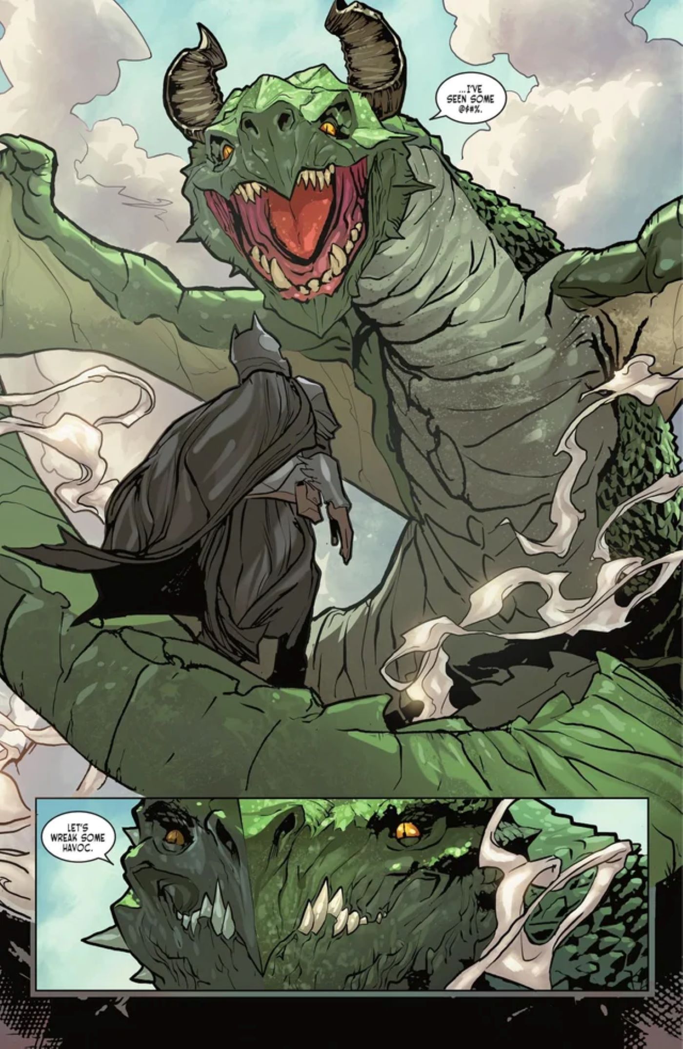 En el Caballeros Oscuros de Acero En una línea temporal alternativa, hay tres reinos al borde de la guerra. El Batman de este universo se esconde mientras se recupera de un ataque y una traición impactante. Mientras está en la granja de El, Batman se da cuenta de que no es la única alma desafortunada acogida por sus rescatadores. A su lado hay jóvenes mágicos llamados los Titanes. En Caballeros Oscuros de Acero #7 – por Tom Taylor y Nathan Gooden – Batman se une a los Titanes y los lectores conocen una de las transformaciones más poderosas de los Chicos Bestia hasta el momento: un dragón que escupe fuego, sobre quien Batman cabalga hacia la batalla.