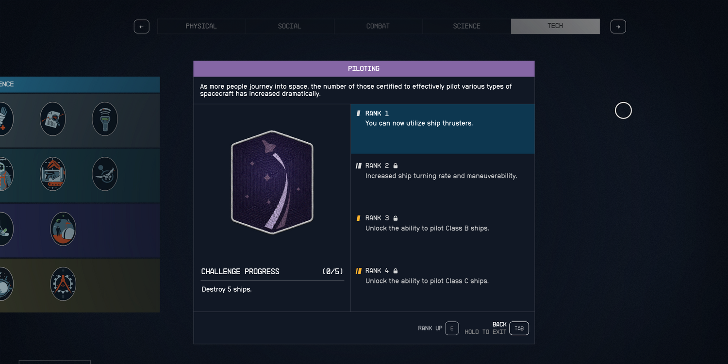 Otro Habilidad tecnológica de nivel 1Pilotar, es poderoso ya que sus rangos posteriores te permiten pilotar los mejores barcos en campo estelar. Sus rangos inferiores también son útiles, ya que permiten que tus naves utilicen propulsores y tengan una mejor capacidad de movimiento. La combinación de estos dos rasgos hace que pilotar sea una ventaja poderosa. Tener un buen barco que pueda moverse rápido es valioso sin importar lo que intentes hacer, ya que evadir y luchar será más fácil con esas características.