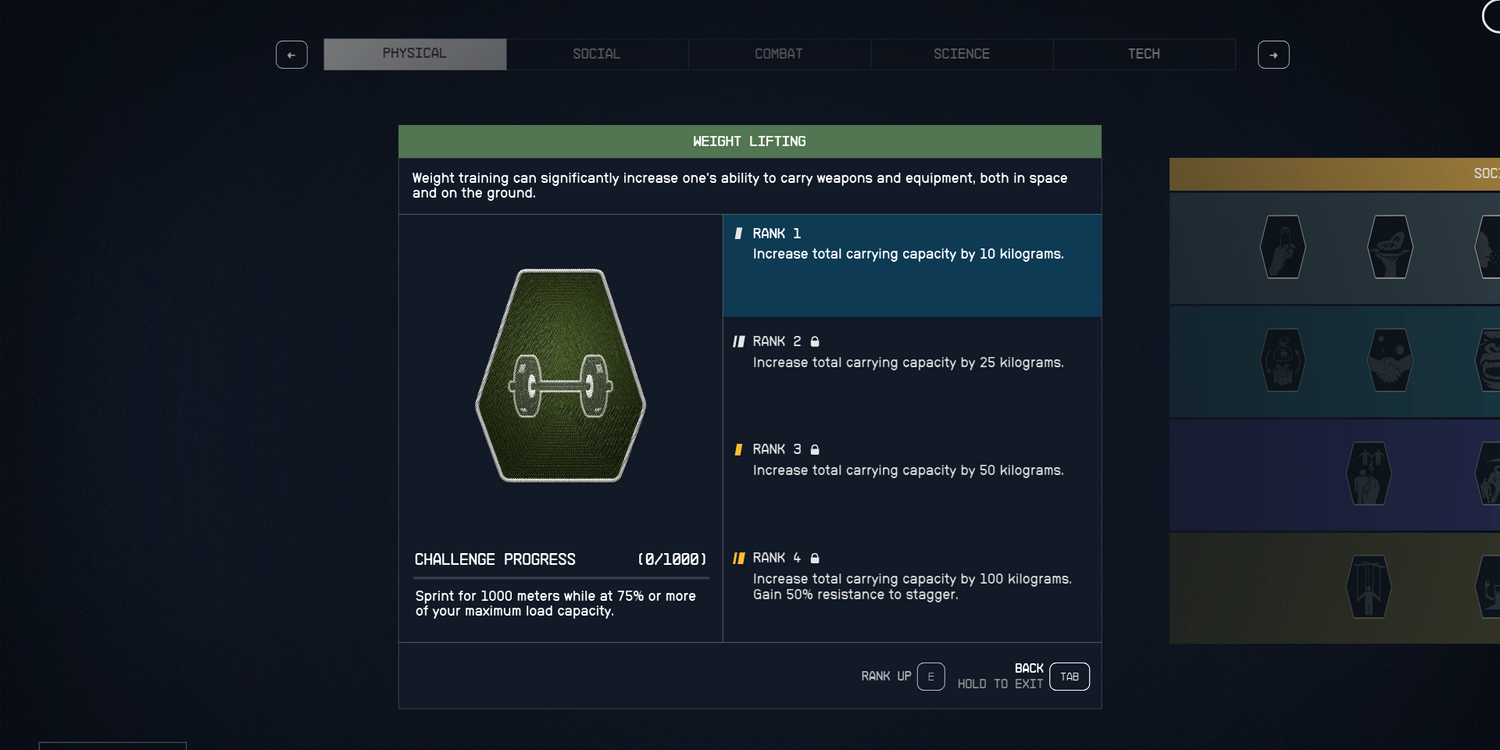 El levantamiento de pesas es un beneficio que casi todos querrán obtener de inmediato, ya que es la única forma de permanentemente aumentar la capacidad de carga en campo estelar sin trampas. Es un Habilidad física de nivel 1 eso aumenta tu capacidad con ganancias cada vez mayores en cada rango, y el último rango también te hace resistente a ser tambaleado. Esta puede ser una resistencia de vida o muerte en situaciones de combate, sin importar qué tipo de carrera estés jugando.