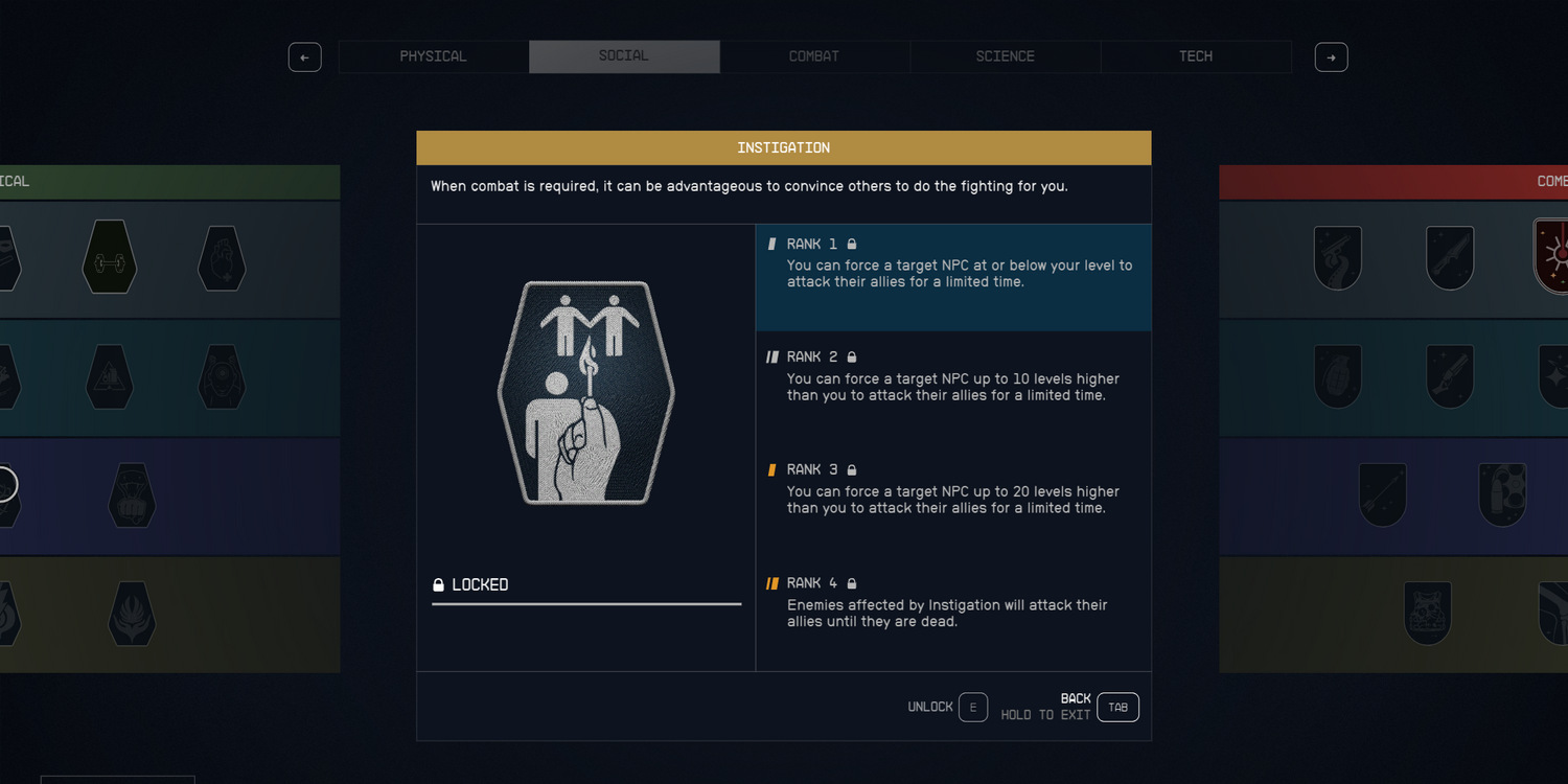 La instigación también es una forma de manipular a los NPC y es una Beneficio social de nivel 3. Esta ventaja, sin embargo, te permite decirle a ese NPC que, sin rodeos, matar a todos sus amigos. Como es el NPC quien realiza el acto, esto técnicamente te permite permanecer inocente, aunque eso ampliaría la definición de la palabra. Pero para aquellos que quieran evitar el combate o construir principalmente alrededor Habilidades Sociales en campo estelareste beneficio puede permitir que otros luchen por ti.