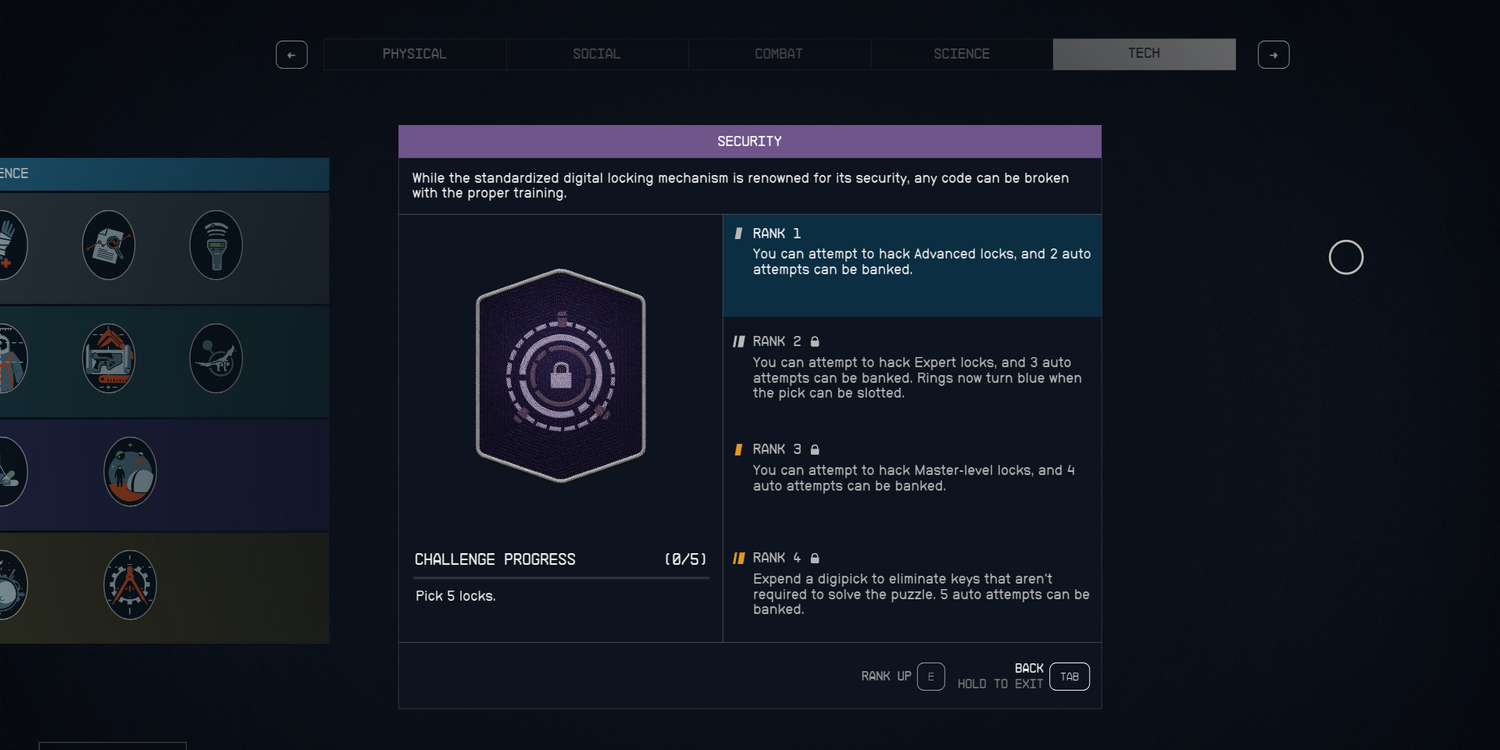 La seguridad es un Habilidad tecnológica de nivel 1 en campo estelar, lo que significa que puedes adquirirlo temprano y potencialmente incluso antes del final de la primera misión si lo eligen como parte del trasfondo de su personaje. Este beneficio es poderoso ya que amplía enormemente tu capacidad de uso. Digipicks, que puede ser difícil de encontrar al comienzo del juego y facilita el desbloqueo de puertas y cajas fuertes. Esto le permite ganar botín mejor y de mayor nivel anteriormente en el juego y encontrar mejores artículos para vender o usar por sí mismos.
