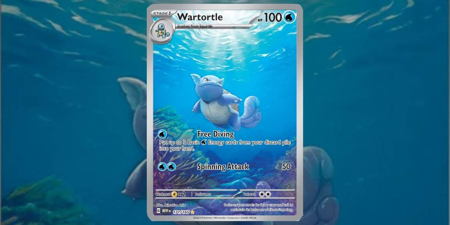 A menudo, la evolución intermedia incluso de los Pokémon más queridos no parece ser tan valorada como la primera y la tercera versión. En este caso, sin embargo, la segunda evolución de Squirtle, Wartortle, es una ilustración oceánica impresionante que es bastante valorado con un TCGPlayer precio de mercado de $22.47 USD al momento de escribir este artículo. Esta obra de arte coincide con el resto de las ilustraciones completas de la evolución de Squirtle, aunque, a diferencia de Charmander, este tipo Agua se adentra más profundamente en el agua con cada versión.