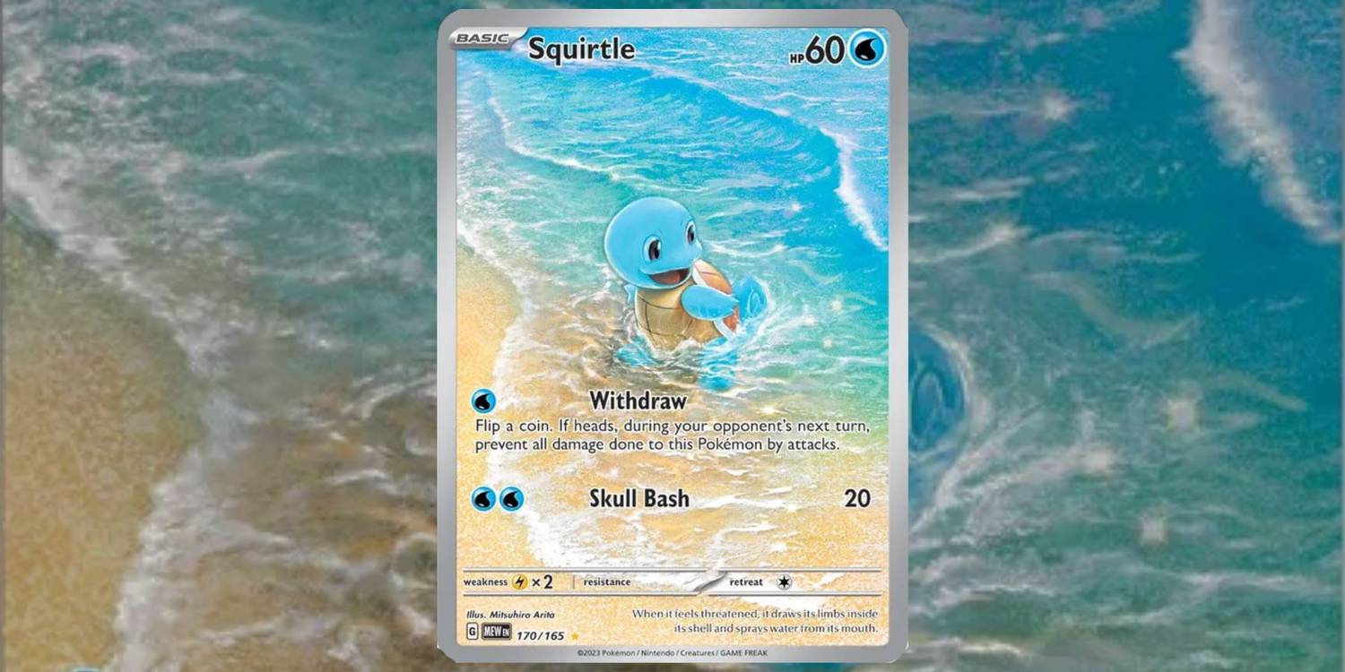 JCC Pokémon: Escarlata y Violeta 151La tarjeta secreta número 170 es una encantadora escena de playa del adorable iniciador de tipo Agua, Squirtle. A menudo, los Pokémon de la primera evolución se representan con un sentimiento más feliz que sus versiones posteriores, y esto sigue el mismo tema. La tarjeta con arte completo muestra el lado juguetón de Squirtle. mientras se sienta alegremente en la parte poco profunda de la marea entrante y juega con las olas que llegan. Incluso además de verse linda, esta tarjeta 170/165 figura actualmente en TCGPlayer con un precio de mercado de $27.29 USD.