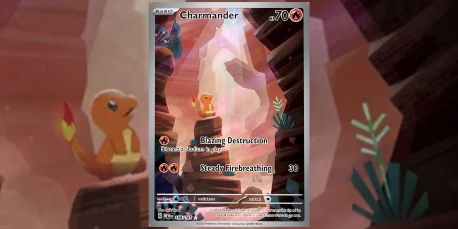 Charmander, uno de los 151 Pokémon originales más reconocibles y tradicionales, recibe una ilustración especial de arte de tarjeta completa Rara para el número 168/165. Aunque su mecánica de juego no es nada innovadora y solo tiene 70 HP, Charmander está bellamente ilustrado para esta tarjeta. Junto con sus cartas secretas con arte completo de Charmeleon y Charizard, La historia de Charmander apenas comienza con esta ilustración que mira hacia el cielo.. En TCGPlayer, Charmander 168/165 tiene actualmente un precio de mercado de 28,68 dólares.