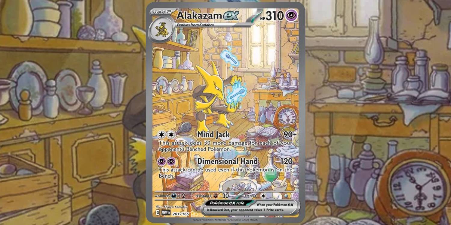 Ilustración especial Rare Alakazam ex está designada con el número de tarjeta 201/165 y muestra una de las ilustraciones más divertidas y adorables de todas en este Pokémon TCG colocar. El artista Mitsuhiro Arita retrata El ex de Alakazam en una cocina desastrosamente desordenada mientras levita cucharas frente a él en una hermosa ilustración de tarjeta completa que parece una página de un libro de cuentos. Alakazam ex 201/165 tiene un valor de mercado de $29.72 USD en TCGPlayer.
