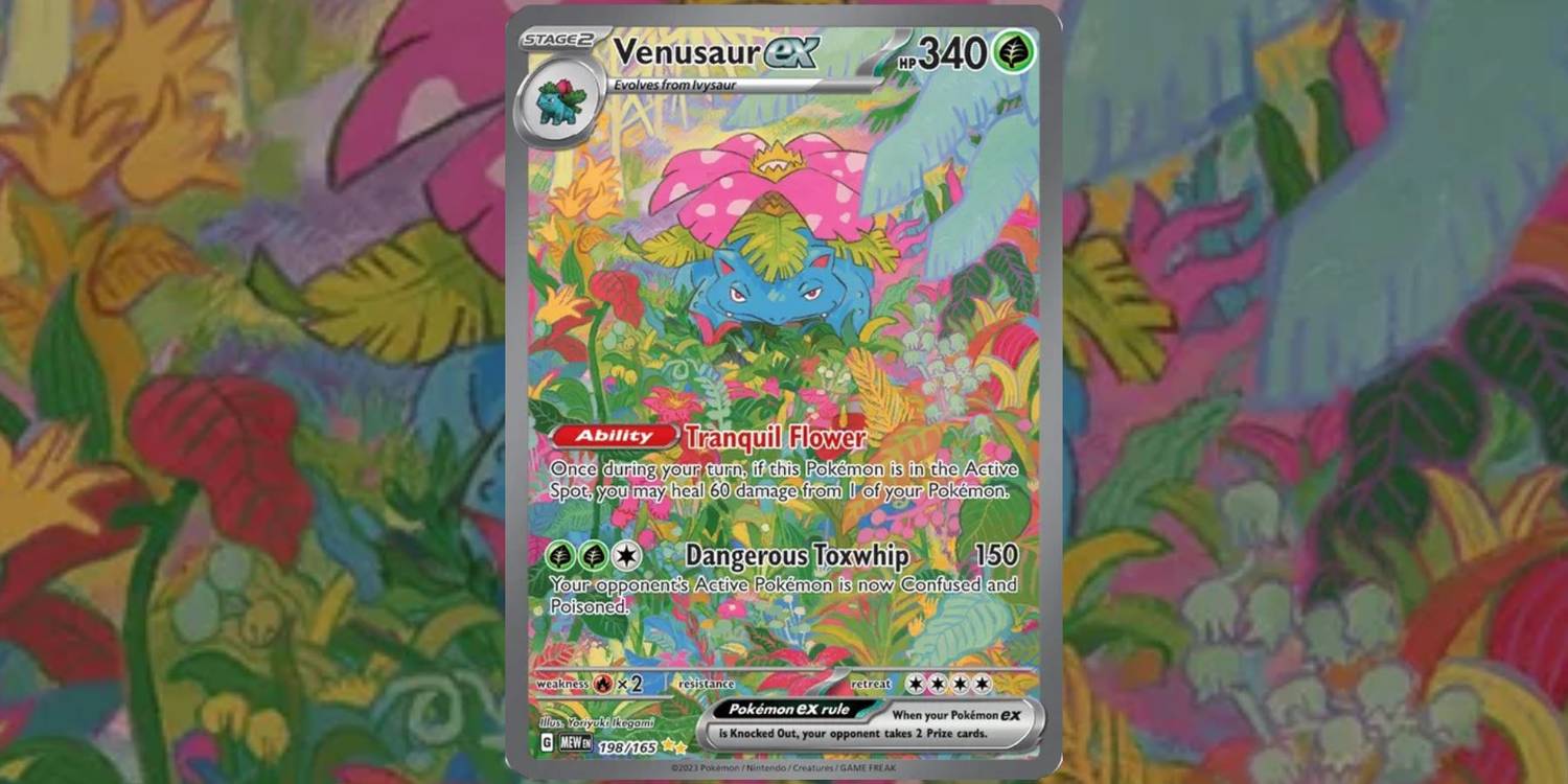 A Ilustración especial Una versión rara de Venusaur ex recibe un hermoso fondo floral. para resaltar su habilidad Flor Tranquila en la carta número 198/165. Esta carta ex de Venusaur presenta un arte de carta completo que es lo suficientemente bonito como para enmarcarlo y al mismo tiempo brinda efectos beneficiosos de curación o envenenamiento cuando se juega. Como parte de la línea de evolución del Bulbasaur mencionado anteriormente, se muestra en un entorno similar pero con flores más vibrantes y coloridas a su alrededor. Actualmente, en TCGPlayer, Pokémon 151El Venusaur ex de está valuado a un precio de mercado de $41.79 USD.