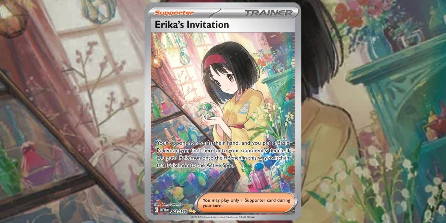 La única tarjeta de soporte que se incluye en esta lista, la invitación de Erika.es una tarjeta de arte completo rara con ilustración especial en el Pokémon 151 colocar. La tarjeta número 203/165 es una tarjeta de apoyo donde la obra de arte de Cona Nitando muestra a la bella entrenadora, Erika, entre flores y perfumes en una habitación soleada y perfectamente rústica. En TCGPlayeresta tarjeta cotiza actualmente con un valor de mercado de $20.17 USD.