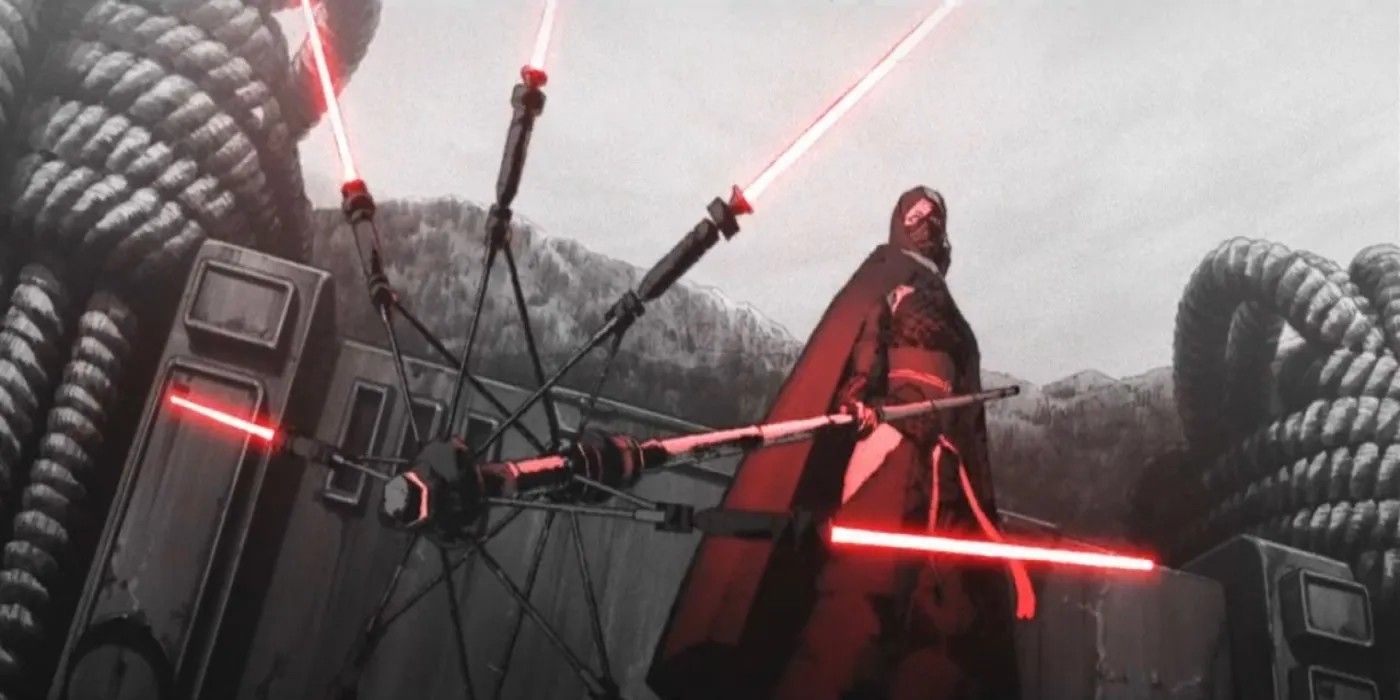 Si bien la sombrilla del sable de luz puede parecer poco práctica e innecesaria, no se puede negar que es uno de los diseños de empuñadura más exclusivos de todos. Guerra de las Galaxias. Empuñado por un Sith llamado Kouru en Visiones de Star Wars, Este sable de luz presentaba ocho hojas plegables que podían girar a altas velocidades.. Similar a la espada de un Inquisidor, la sombrilla del sable de luz de Kouru le permitió bloquear una enorme cantidad de fuego que se aproximaba.
