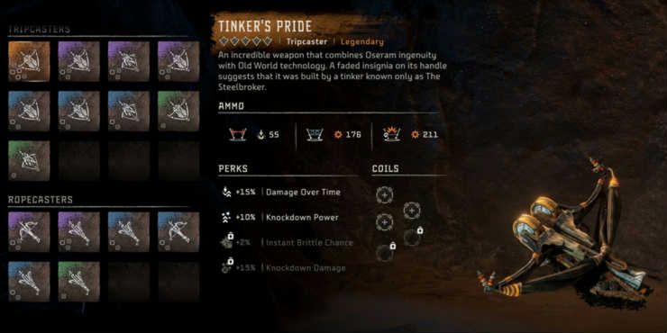 El primer Tripcaster que recibe Aloy es útil, pero tiene sus límites. Solo capaz de colocar trampas de choque para hacer tropezar a las máquinas, su eficacia se desgasta después del juego inicial, ya que muchas de las máquinas posteriores son inmunes a los golpes. Sin embargo, el Shadow Tripcaster conserva su utilidad al darle a Aloy tres trampas diferentes para lanzar.