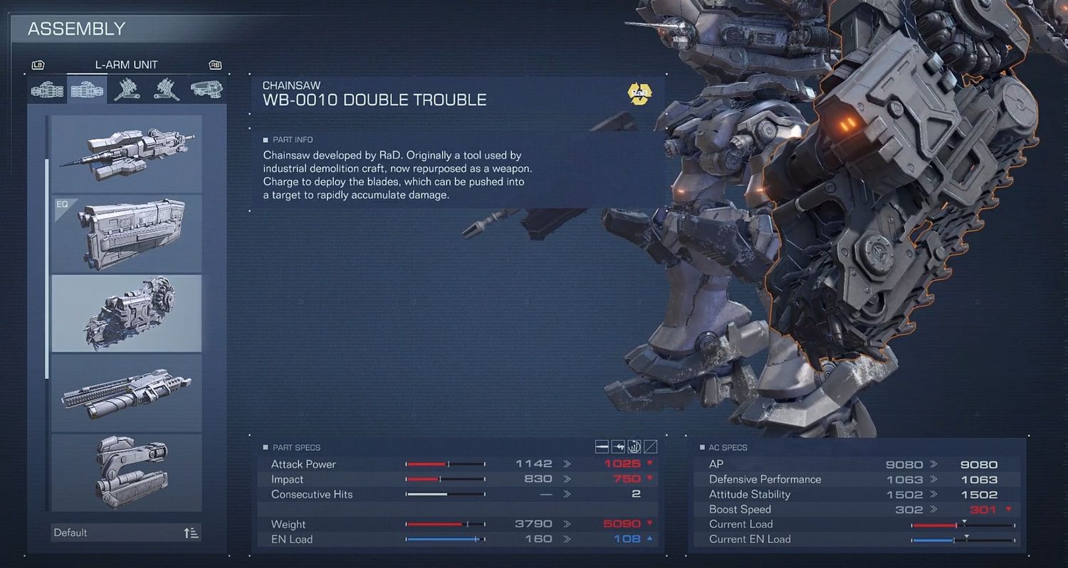La motosierra es sin duda el arma cuerpo a cuerpo más poderosa. Solo causa 1025 de daño al impactar, pero puede golpear rápidamente hasta cuatro, seis o incluso ocho veces. Esto depende principalmente de la velocidad y agilidad del jefe de misión actual en Núcleo blindado 6. En cambio, esto puede hacer que la motosierra sea muy peligrosa, ya que un ataque completamente fallido puede dejarte expuesto al castigo de un ataque enemigo.