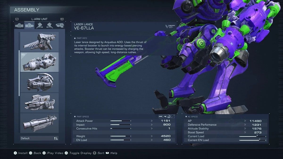 El VE-67LLA inflige 1151 de daño al golpear y no combina tan bien. También es bastante pesado con 4520 unidades, por lo que sólo es significativo en un modelo más ligero. Núcleo blindado 6 mecánico. Pero la lanza incluye una carrera de larga distancia que puede bloquear fácilmente a un enemigo. Esto la convierte en un arma fácil de disparar incluso para configuraciones principalmente a distancia. También se puede utilizar con Pulse Blade para configurar un combo de avance y seguimiento.