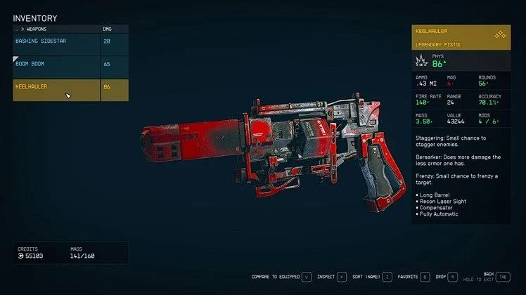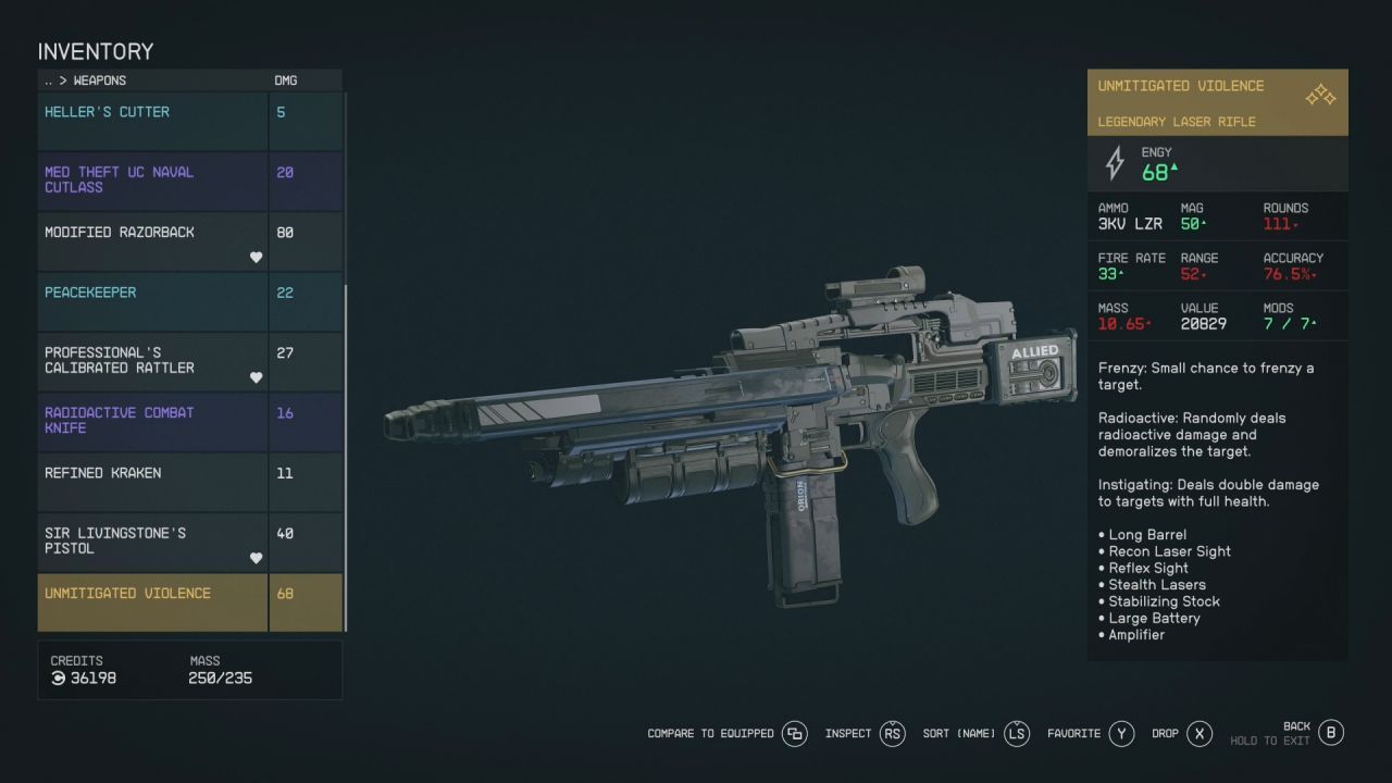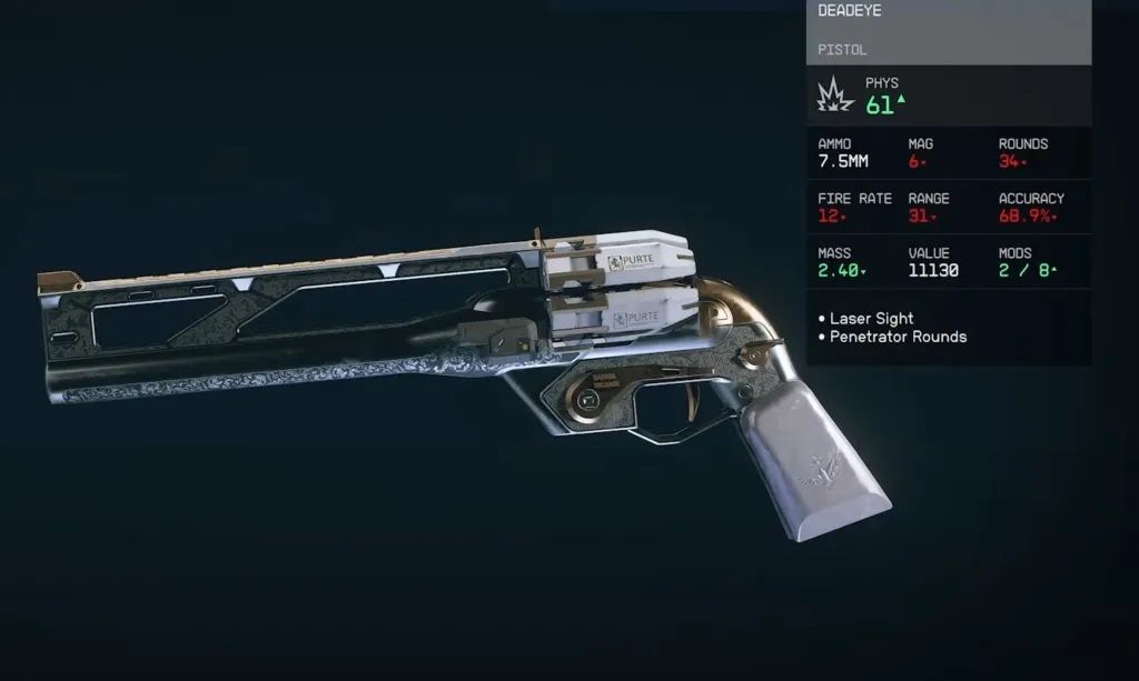 Todas las armas tienen varias estadísticas y atributos para comparar entre sí. Existe el tipo de daño, que va desde físico, energético, de fuego, radiactivo o electromagnético. También hay que considerar la velocidad de disparo, el tamaño del cargador y la munición total. Finalmente, todos los artículos tienen una masa que puede provocar obstáculos y un movimiento lento en campo estelar. Asegúrese de almacenar armas innecesarias en su barco u otro contenedor.