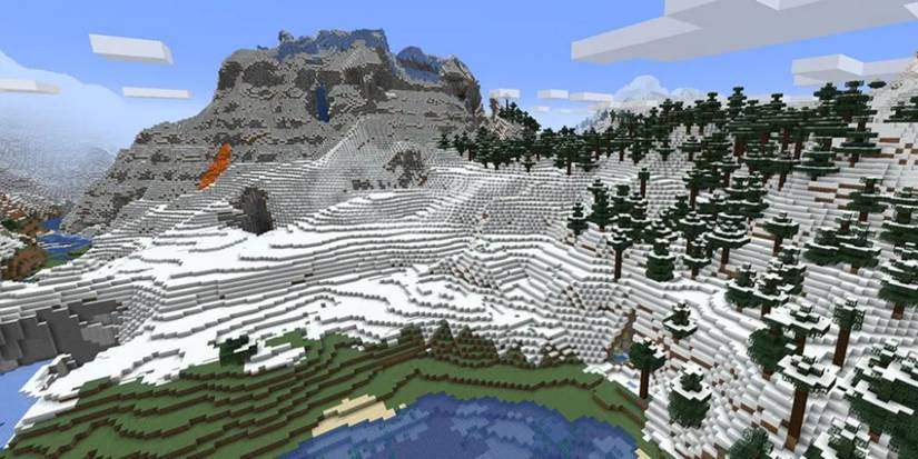 La zona tiene mucho que ofrecer a los amantes del clima frío. Si estás dispuesto a dar un paseo, incluso puedes encontrar una aldea de taiga zombie a unas 1200 cuadras al oeste de Spawn si quieres curar a los aldeanos zombies en Minecraft. La semilla se siente como una ruina perdida hace mucho tiempo en una montaña nevada, excepto que estas ruinas acechan bajo la nieve.