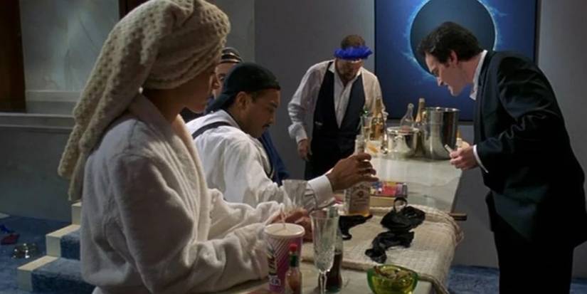 Tarantino Ficción pulpa Fue sin duda el ejemplo más destacado de Big Kahuna Burger en cualquier película, y ciertamente el más icónico. Si bien no fue la primera aparición, es el momento que transformó a Big Kahuna Burger de una colocación de producto de corta duración a una querida franquicia ficticia. Tiene lugar durante la famosa escena en la que Vincent Vega (John Travolta) y Jules Winnfield (Samuel L. Jackson) visitan un apartamento para cobrar una deuda con Marsellus Wallace (Ving Rhames). Jules se acerca a Brett (Frank Whaley), que está desayunando una hamburguesa Big Kahuna.