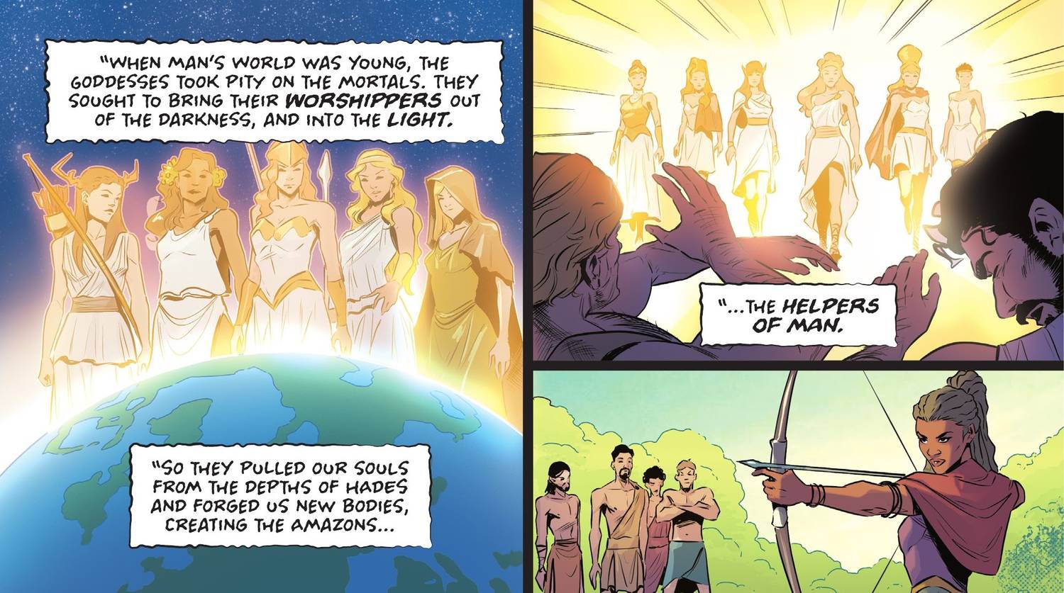 Asylum comienza su monólogo lleno de revelaciones revelando que, por compasión para elevar a sus adoradores de la oscuridad a la luz, las diosas griegas extrajeron almas del Hades y les otorgaron nuevos cuerpos, creando así las Amazonas, también conocidas como “los ayudantes del hombre“. Por lo tanto, la intención de las diosas era que las amazonas ayudaran a guiar a los hombres hacia una nueva era de iluminación y progreso, guiando a reyes, inventores y guerreros. Las Amazonas se embarcaron en su misión de educar a los hombres sobre la guerra, la caza, la ciencia, el arte y el liderazgo, cumpliendo su propósito divino. Sin embargo, los hombres finalmente se volvieron contra las Amazonas, percibiéndolas como demasiado poderosas.