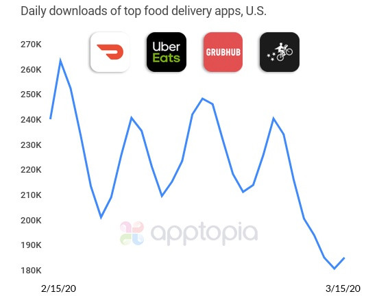 A pesar de las promesas de entrega sin contacto de varios proveedores, incluido Uber Eats, las aplicaciones de entrega de alimentos no están experimentando un aumento similar en las descargas diarias. Según Apptopia, el mercado de entrega de alimentos a principios de marzo estaba empezando a enfriarse. Más tarde comenzó a recuperarse, pero luego se enfrió nuevamente cuando los consumidores se dieron cuenta del gasto de pedir comida en comparación con la cocina casera, y porque algunos consumidores consideran que la entrega de restaurantes no es tan segura como cocinar en casa.