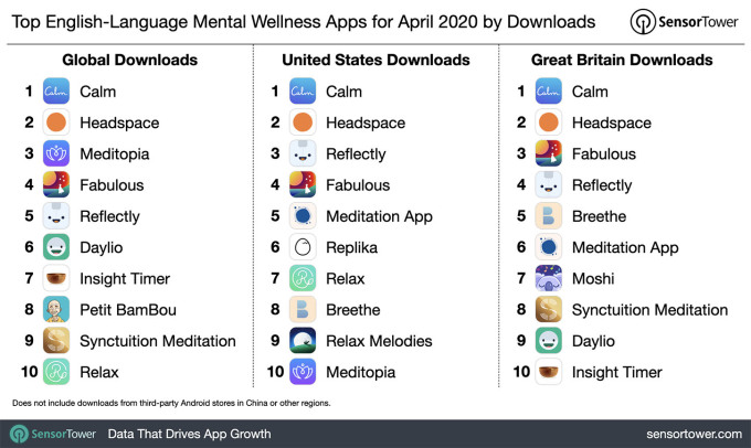 Las listas fueron dominadas por los líderes del mercado, incluyendo la aplicación No. 1 Calm con 3,9 millones de descargas en abril, seguido por Headspace con 1,5 millones de descargas, luego Meditopia, con 1,4 millones. De ellos, Calm vio el mayor número de nuevas instalaciones con más de 911.000 descargas más en abril en comparación con enero, un aumento de casi 31%. Otra aplicación, Relax: Master Your Destiny, creció un 218% desde el comienzo del año, recogiendo 391.000 descargas en abril.