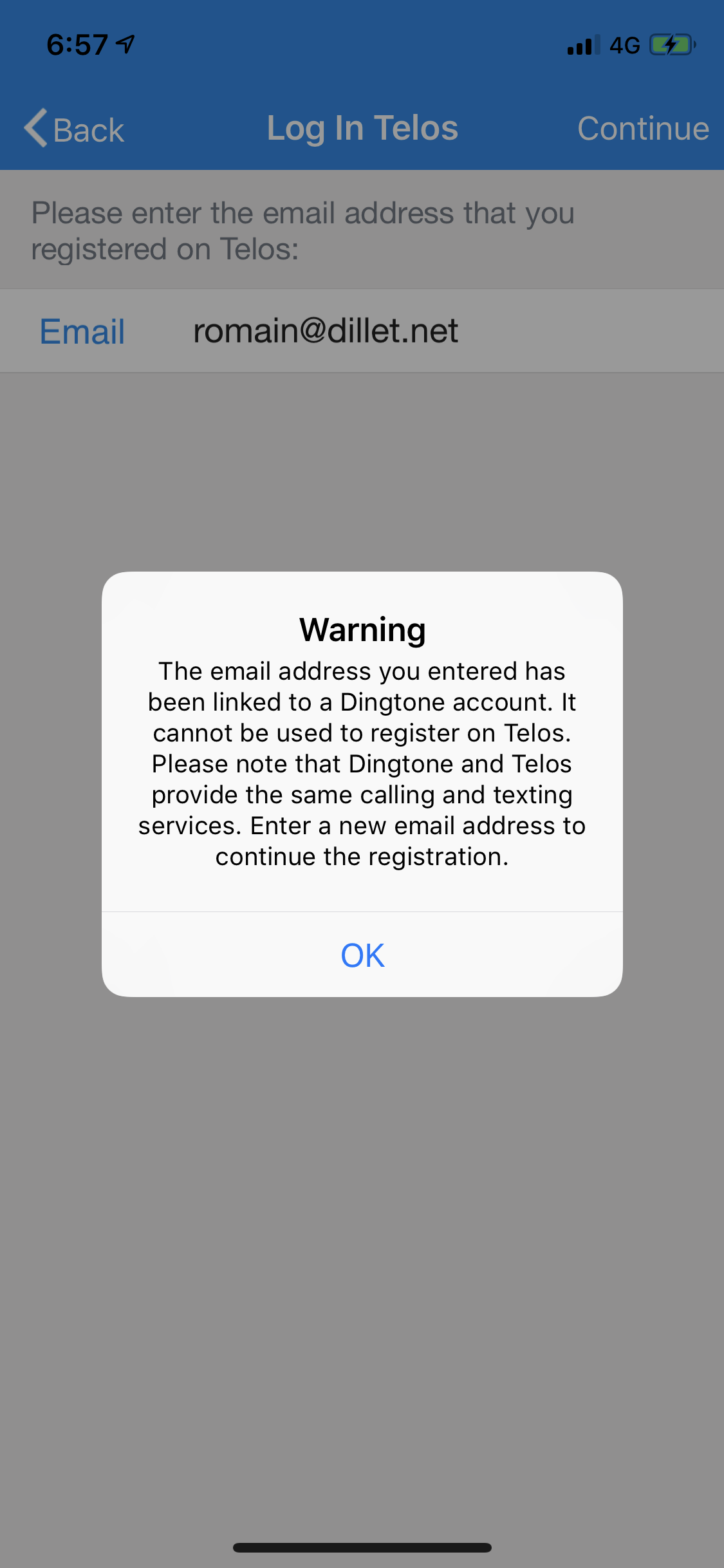 En el papel, Dingtone y Telos parecen dos aplicaciones diferentes de dos compañías diferentes. Descargué la aplicación Dingtone y me registré con mi dirección de correo electrónico. Luego descargué la aplicación Telos y me registré con la misma dirección de correo electrónico. Aquí está el mensaje que recibí: