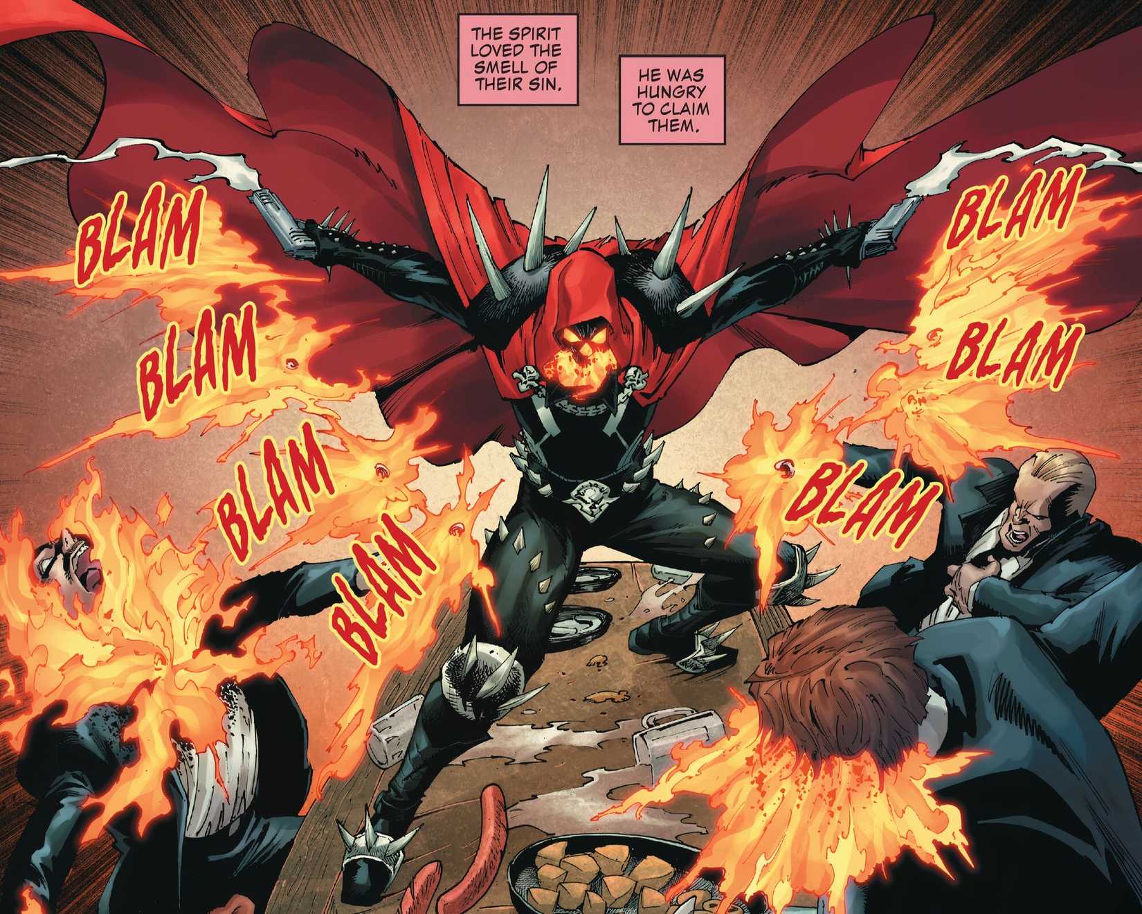 En la última página del avance, el Capucha libera múltiples tentáculos hechos de las clásicas cadenas del infierno que perforan y destrozan el destello de Blaze. Es terriblemente brutal; las cadenas estallan a través de la boca, las manos y las piernas de Johnny en una exhibición agonizante de sangre y llamas. Está claro que el Capucha no se rendirá sin luchar. Pero Johnny Blaze sabe una cosa o dos sobre la venganza y la brutalidad de llevarla a cabo. De una forma u otra, el tumultuoso viaje de Johnny Blaze para recuperar su Espíritu de Venganza y recuperar su título como el Motorista fantasma Pronto terminará.