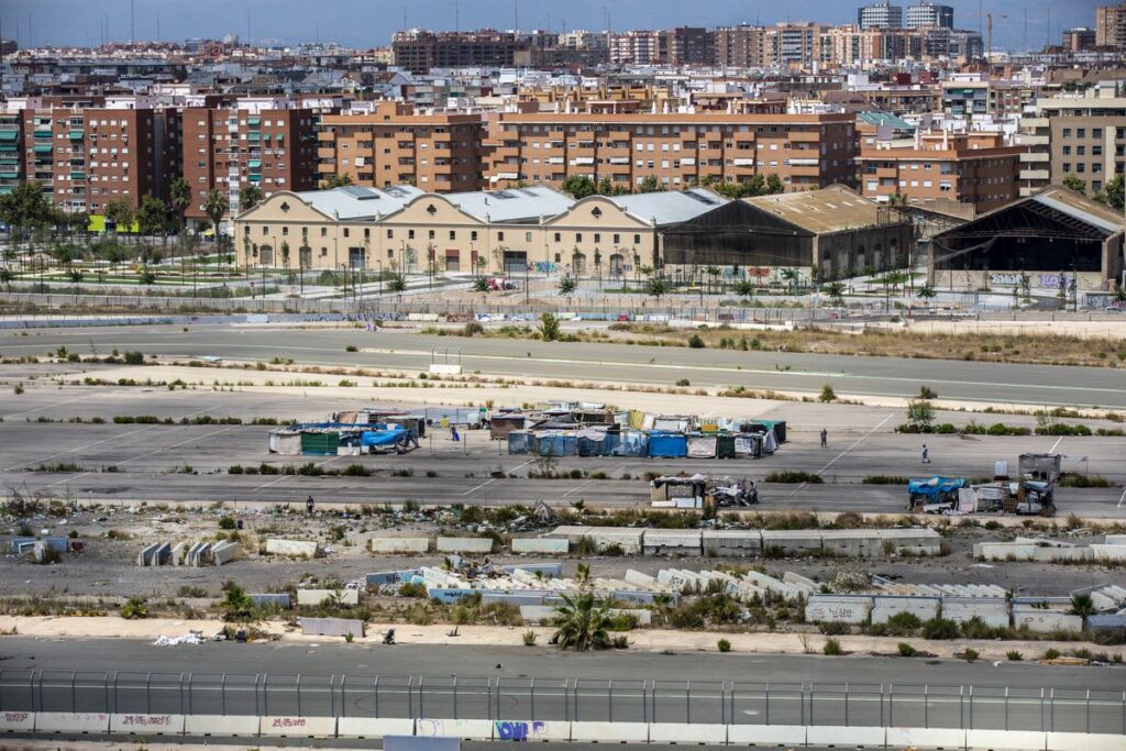 Nabil, de 30 años, no sabía que el asfalto sobre el que se asienta la chabola donde vive fue parte del circuito de Fórmula 1 de Valencia. Fernando Alonso ganó el gran premio en 2012, el último año en que los bólidos disputaron una carrera por la ciudad. Desde entonces, el circuito urbano cuya construcción costó 98,5 millones de euros a la Generalitat, ha permanecido cerrado y abandonado. Pero dentro de su perímetro, vallado en su mayor parte, ha ido creciendo un pequeño poblado de inmigrantes en mitad de una enorme explanada, mientras se busca una salida al fiasco inmobiliario que frena el desarrollo urbanístico de esta privilegiada zona frente al mar. Allí se dirige el joven marroquí, que se gana la vida ayudando a aparcar coches en la cercana playa de la Malvarrosa, cargado con bolsas llenas de botellas de agua y algo de comer.
