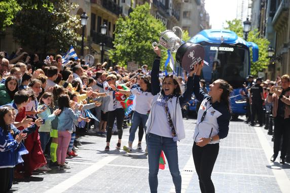 Ya dentro, cada una de las futbolistas ha recibido una txapela conmemorativa de la hazaña, la conquista de la Copa de la Reina en Granada. Tras el aurresku de honor, de nuevo fiesta de las chicas, que, entre otros, han contado un clásico como ‘Txoriak, txori’.