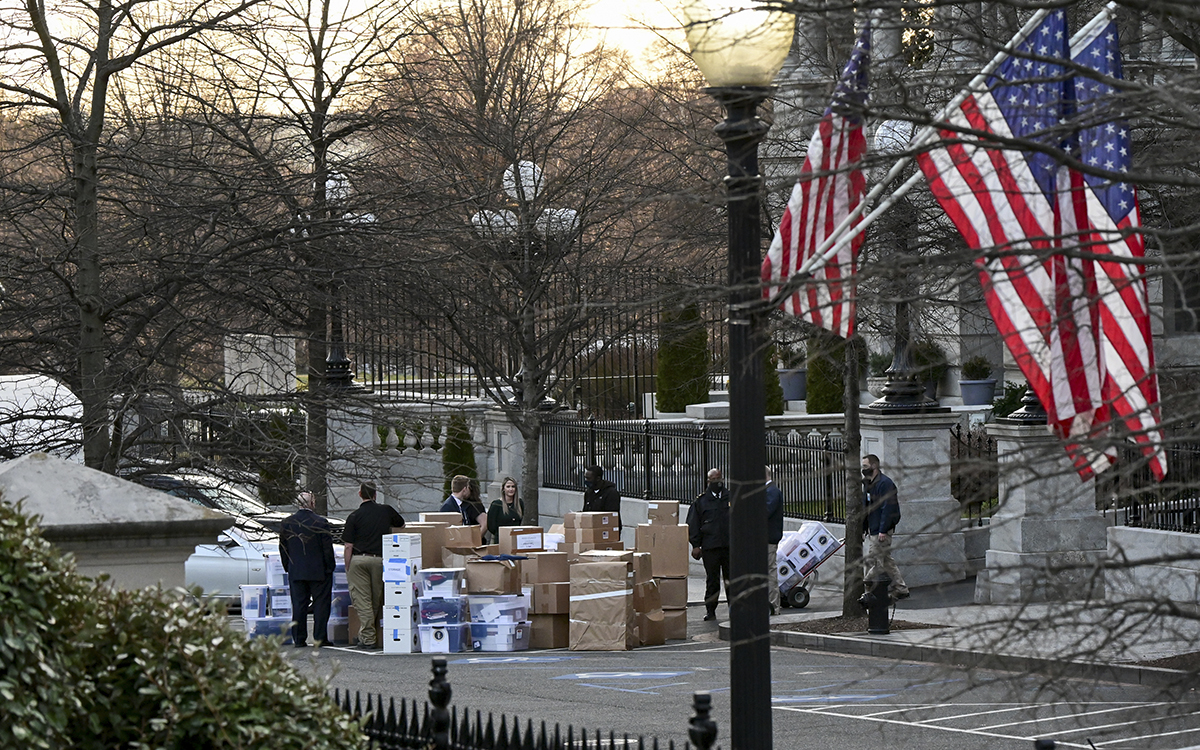 Trabajadores sacan cajas del edificio de la oficina ejecutiva de Eisenhower en los terrenos de la Casa Blanca en Washington. Foto: Reuters.