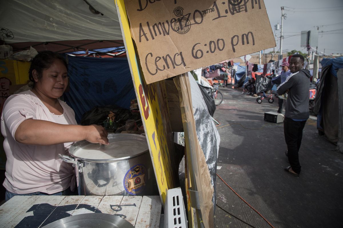 María Elena Pérez Nava alza la olla vacía para mostrarla y en un tono entre la disculpa y el reclamo grita a la fila que espera el desayuno: “¿Pues no ven que ya se acabó? Ya no queda nada, ¡se terminaron toda la avena!”. Es la encargada de la única cocina de El Chaparral, un campamento de migrantes centroamericanos a la espera de asilo político. En esta explanada de la garita peatonal entre Tijuana y San Ysidro, donde se apiñan las tiendas de campaña, familias enteras llevan meses esperando a entrar en Estados Unidos. Las organizaciones cuentan 300 personas, 1.000…, otras doblan esta última cifra. De acuerdo con la Subsecretaría de Asuntos Migratorios del Gobierno de Baja California, suman casi 2.000 migrantes en el campamento, de los cuales 800 son menores de edad.