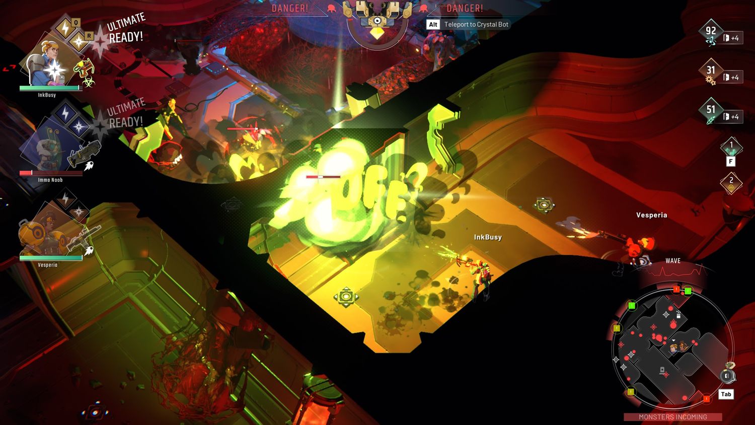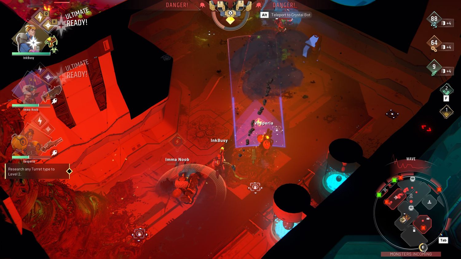 Los héroes individuales tienen sus propias afinidades de clase vagamente legibles (como tanque/curandero/explorador) y las armas pesadas o pistolas que se arrojan como botín están restringidas a ciertos personajes para su uso. Cada uno de ellos también ejerce una habilidad pasiva única, puede equipar hasta dos armas a la vez y usar un movimiento especial y una habilidad definitiva, pero cualquier héroe puede instalar torretas en espacios designados en cada mapa. La mayoría de los grupos de héroes normalmente pueden defenderse de oleadas pequeñas, pero esas torretas rápidamente se convierten en una necesidad. Hay algunas torretas de daño elemental diferentes, así como torretas de mejora, que pueden afectar cosas como el daño crítico o el DPS general en una habitación determinada. Empujar una torreta la repara y, una vez que haya destruido suficientes monstruos, la mejorará para que sea aún más eficiente.